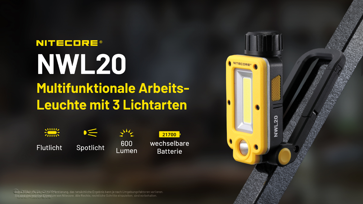 Nitecore NWL20 - Arbeitsleuchte, 600 Lumen Die NWL20 von Nitecore ist eine neue Arbeitsleuchte mit zahlreichen Features. Die NWL20 verfügt über ein COB-Flutlicht zur harmonischen Flächenausleuchtung und ein LED-Spotlicht für einen konzentrierteren Lichtkegel. Ferner ist
