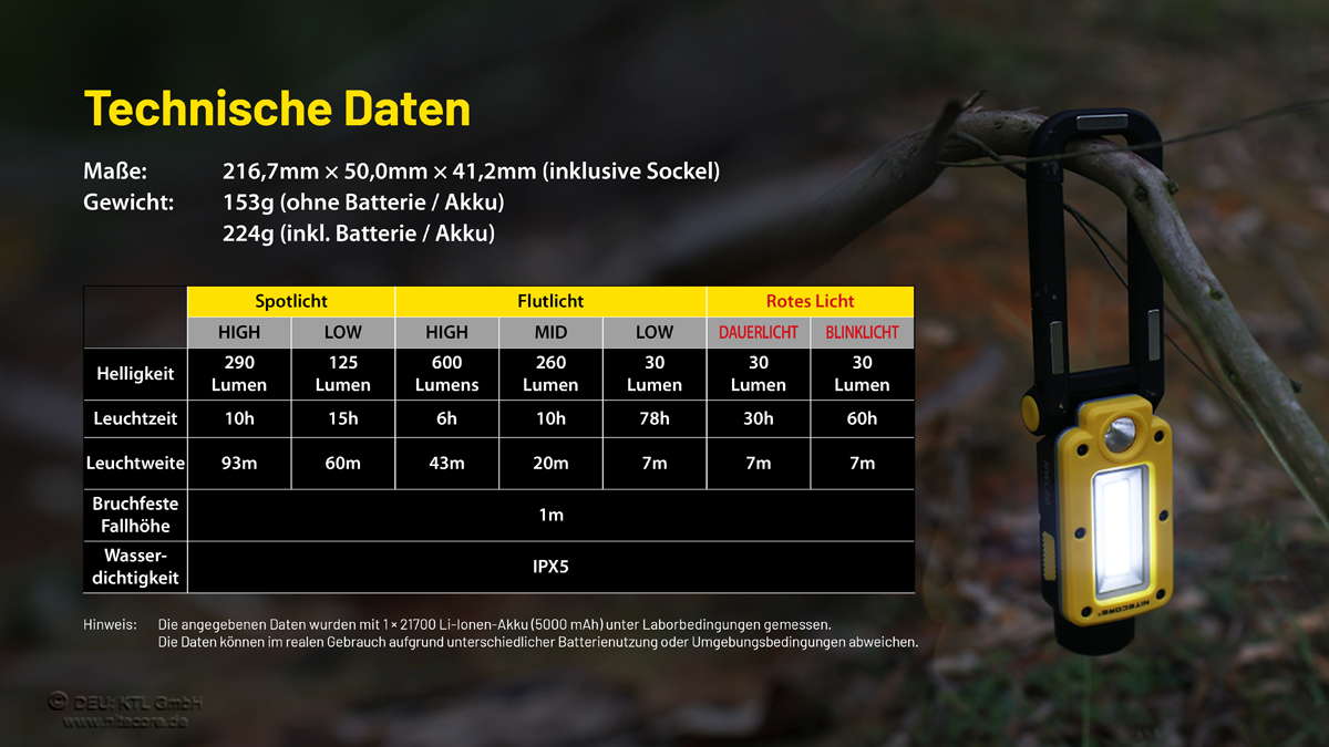 Leistung und Leuchtdauer (Spotlight) High (290 Lumen) für ca. 10 Stunden Low (125 Lumen) für ca. 15 Stunden Leistung und Leuchtdauer (Flutlicht) High (600 Lumen) für ca. 6 Stunden MID (260 Lumen) für ca. 10 Stunden Low (30 Lumen) für ca. 78 Stunden Leistung und Leuchtdauer (Rotlicht) Konstant (30 Lumemn) für ca. 30 Stunden Blingend (30 Lumen) für ca. 60 Stunden Lieferumfang: Nitecore NWL20, Li-Ion Akku NL2150, USB-C-Ladekabel, Bedienungsanleitung