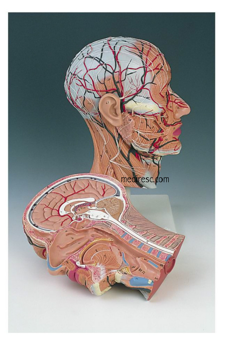 | | C14 Muskelkopfhälfte Median geschnitten. Gezeigt werden: Muskulatur, Nerven und Gefäße sowie sämtliche inneren Strukturen von Kopf und Hals. Auf Stativ. 22*18*46cm. 216,00 € | C14 Muskelkopfhälfte | |