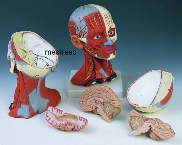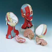 | | | C05 Muskelkopf, 5-teilig 3/4 natürliche Größe. Zur Ansicht der oberflächen und tieferliegenden Muskulatur, Nerven und Gefäße, Schädeldecke abnehmbar, 3-teiliges Gehirn herausnehmbar. Auf Sockel, 18*18*36cm