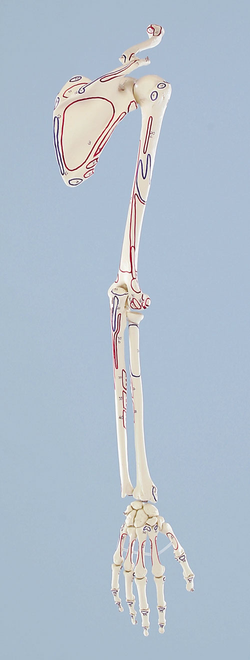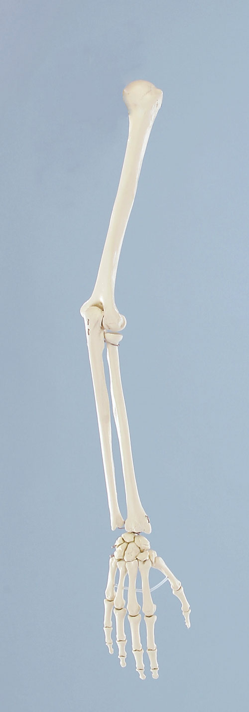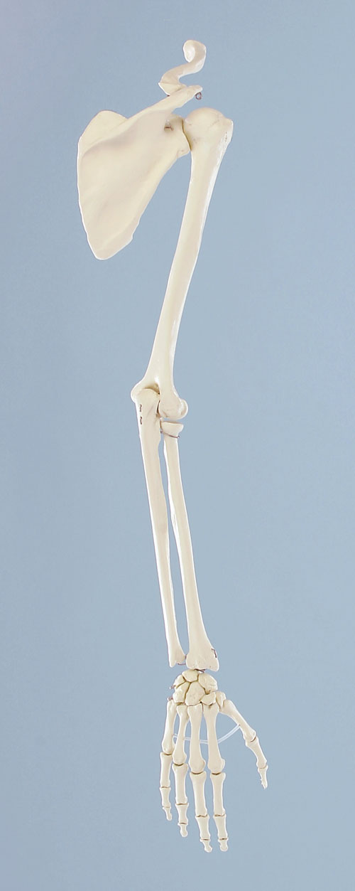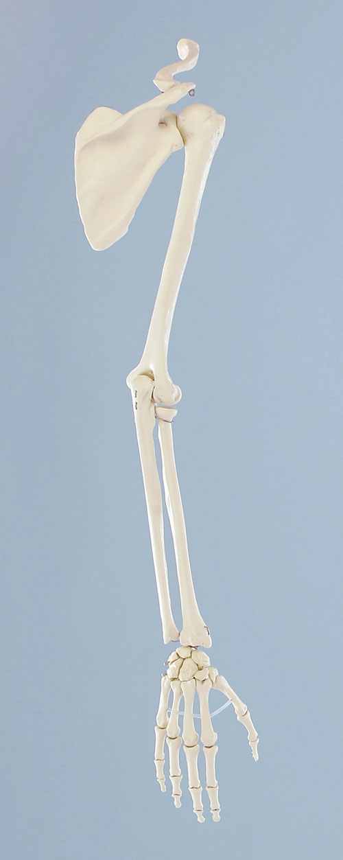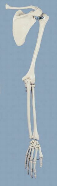 | Obere Extremitäten | Armskelett, beweglich Naturgetreuer Abguß eines menschlichen Armskeletts. Die Umwendbewegung der Unterarmknochen ( Pro- und Supination ) und Bewegungen im Handgelenk sind demonstrierbar. Die Hand ist beweglich auf Draht montiert. Mit Schulterblatt und Schlüsselbein. |