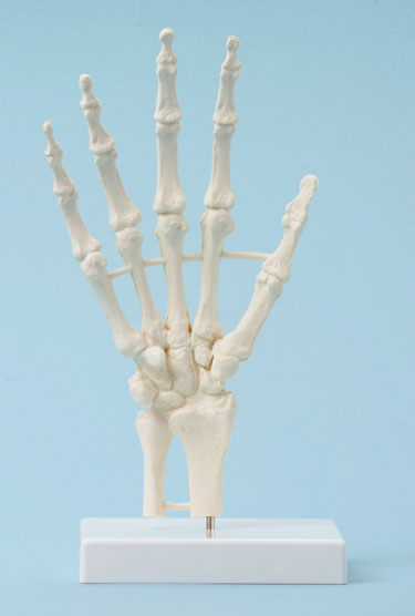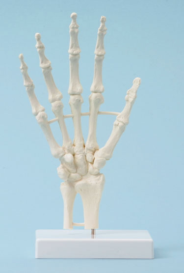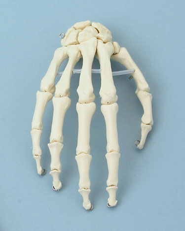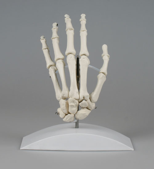 | Handskelett mit beweglichen Handknochen [Artikelnummer:6001S Naturgetreuer Abguß eines menschlichen Handskeletts. Alle Handknochen sind einzeln beweglich auf Draht montiert. Mit Stativ. |