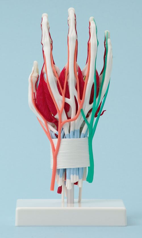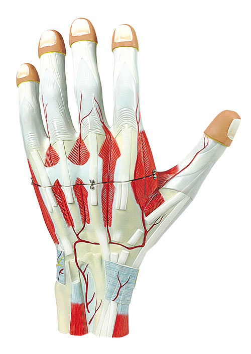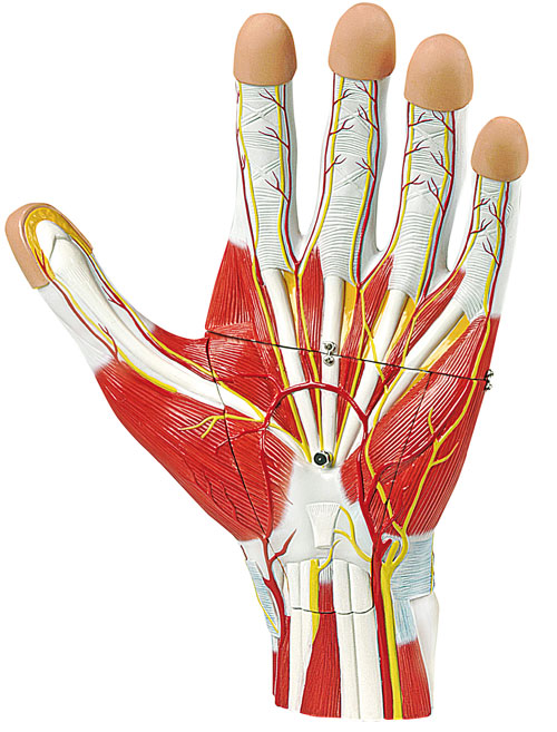 Dieses 3-teilige Modell in doppelter Lebensgröße zeigt anschaulich die Anatomie der Hand einschließlich Muskeln, Nerven, Bändern, Blutgefäßen und Knochenstrukturen. Die Palmarapneurose kann zur genaueren Betrachtung abgenommen werden.