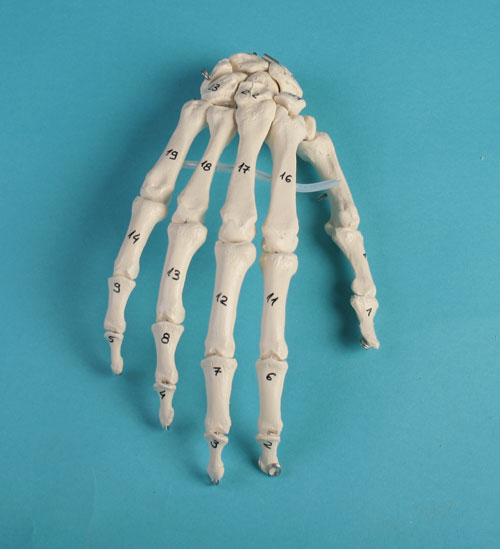 | Handskelett mit NumerierungNaturgetreuer Abguß eines menschlichen Handskeletts. Alle Handknochen sind einzeln beweglich auf Draht montiert. Zusätzlich mit Nummerierung der einzelnen Handknochen. |