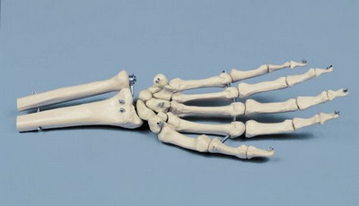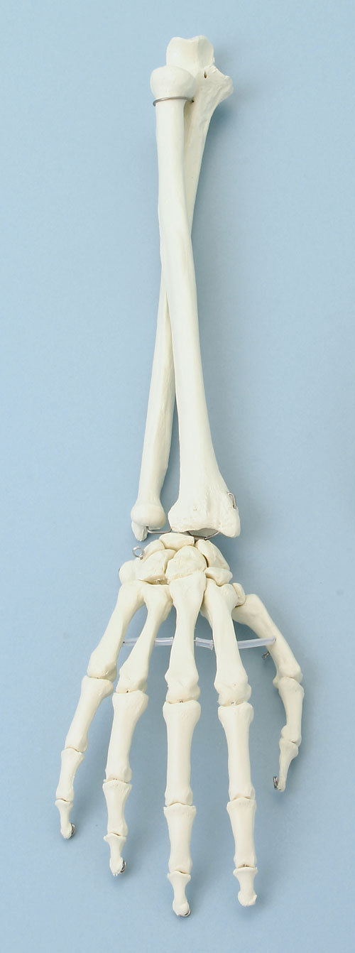 | | | Handskelett mit Unterarm Naturgetreuer Abguß eines menschlichen Handskeletts. Alle Handknochen sind einzeln beweglich auf Draht montiert. Mit Elle und Speiche. Die Umwendbewegung der Unterarmknochen (Pro- und Supination) und Bewegungen im Handgelenk sind demonstrierbar. |