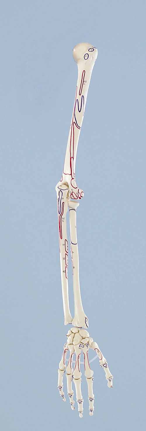 | Armskelett mit Muskelmarkierungen Naturgetreuer Abguß eines meschlichen Armskeletts. Die Umwendbewegung der Unterarmknochen ( Pro- und Supination ) und Bewegungen im Handgelenk sind demonstierbar. Die Hand ist beweglich auf Draht montiert. Mit Markierung der Muskelursprungs- und Ansatzfelder. |