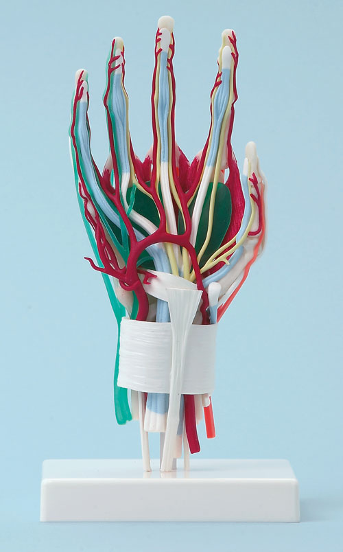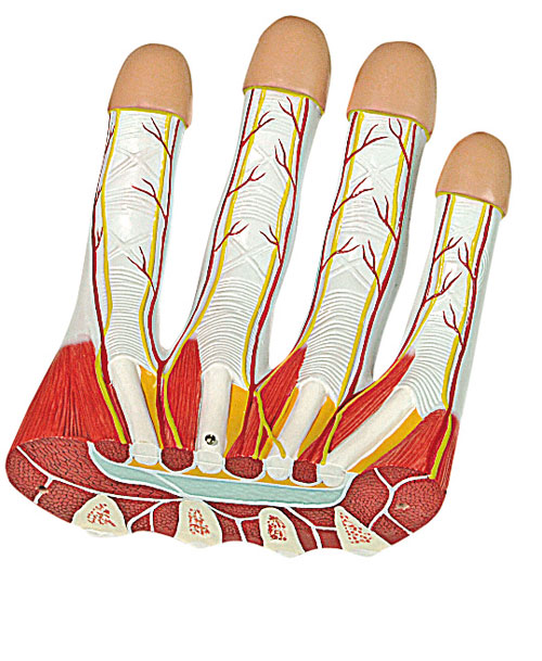 | Hand mit Handgelenk Naturabguß einer Hand mit Darstellung der Zwischenknochenmuskeln, N. medianus, N. ulnaris und N. radialis. Mit Sehnen, Bändern und Aterien. Palmarkammer und Thenarkammer sind erkannbar, das Lig. Transversum kann zur Demonstrationd des Karpaltunnelsyndroms durchtrennt werden. Mit Sockel. |
