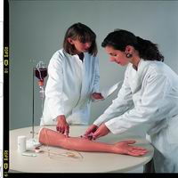 Dieses Modell vereint vier Injektionstechniken in einem Modell. Neben der intravenösen Injektion in Ellenbeuge und Handrücken kann die Intramuskuläre und die Subkutane Injektion geübt werden. Die Intravenöse Injektion im Bereich der Ellenbeuge ist besonders realistisch, da die Venen in ein Gelkissen eingebettet sind, so dass das Stichgefühl wie bei einem echten Arm ist. Für Intramuskuläre und Subkutane Injektion hat das Modell die wichtigen anatomischen Strukturen wie z.B. Knochen, damit der Injektionspunkt gefunden werden kann. Die Subkutane Injektion vermittelt ebenfalls ein lebensechtes Gefühl und kann wie alle anderen Techniken mit Flüssigkeit durchgeführt werden. Das Modell kann im Ellenbogen verstellt werden, so dass die richtige Injektionsposition eingestellt werden kann. Mit Transporttasche. | LM 74 Universal Injektionsarm | 1799,00 | |