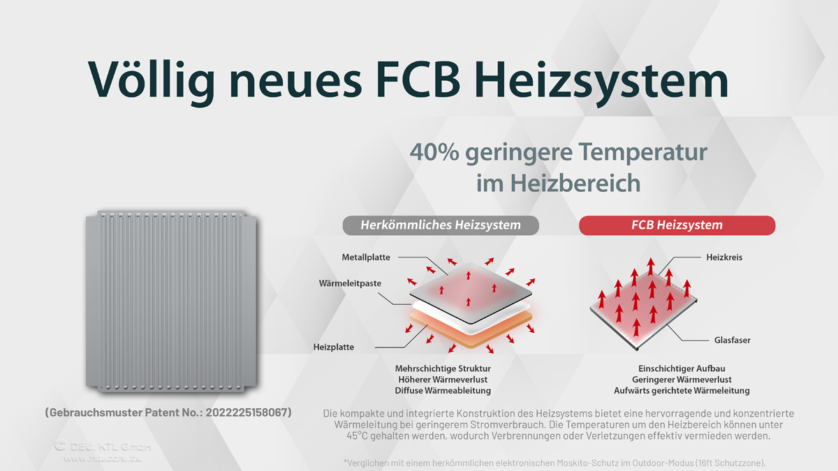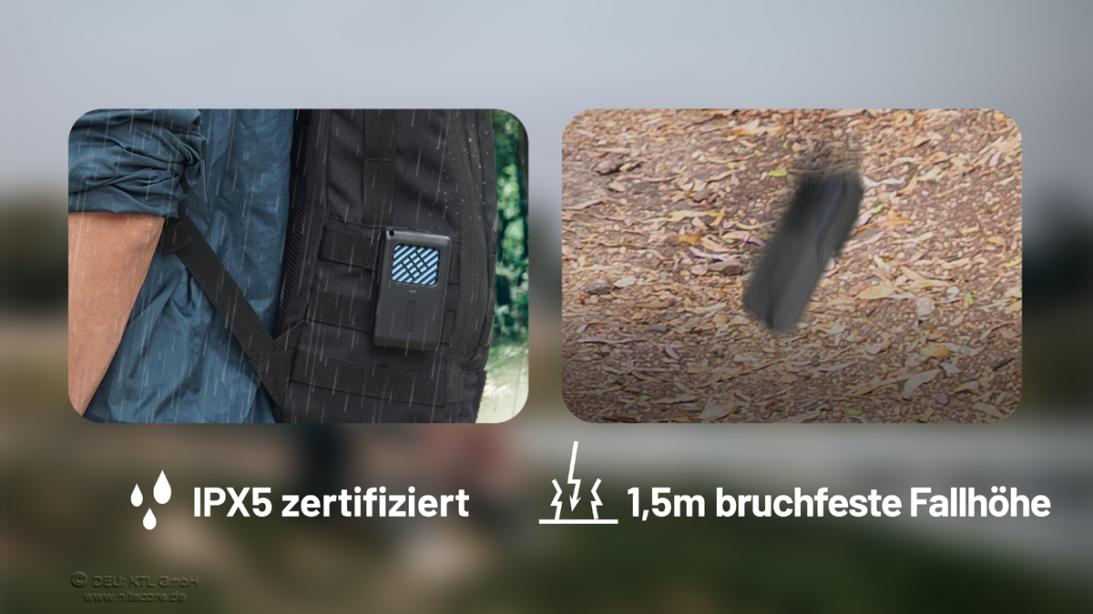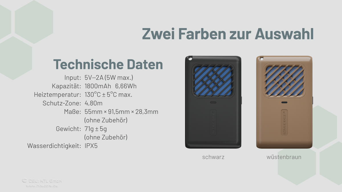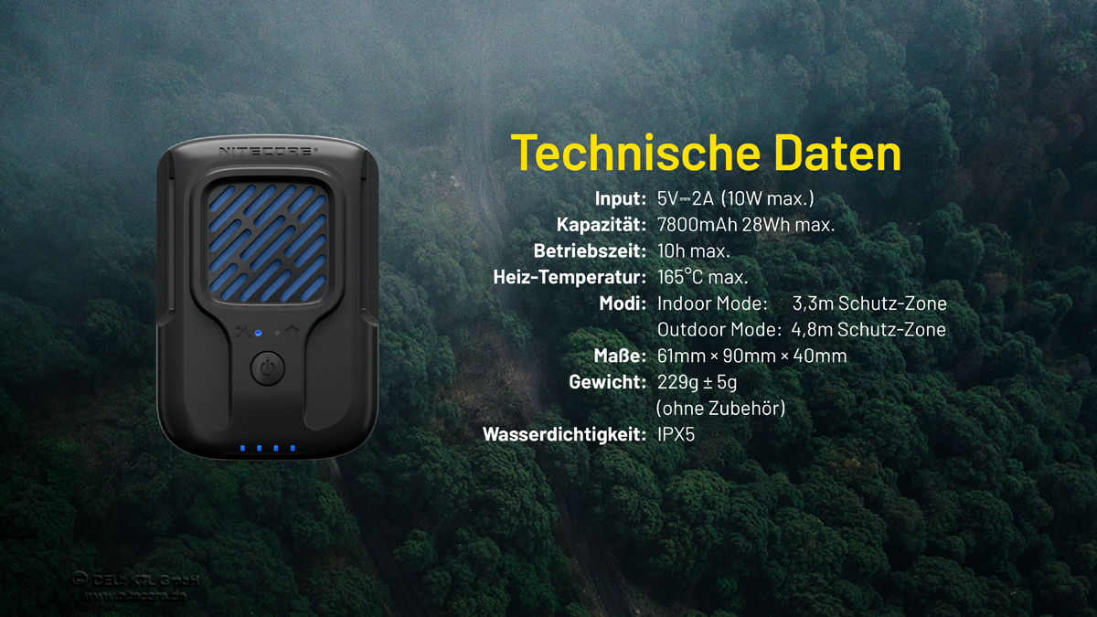 Eigenschaften Heiztemperatur: 165C +/- 5°C Schutzzone: max. 5 Meter (Outdoor Mode), ca. 3.5 m (Indoor Mode) Wasserdicht IPX5 -- Bruchfest 1 Meter -- Akkustandanzeige