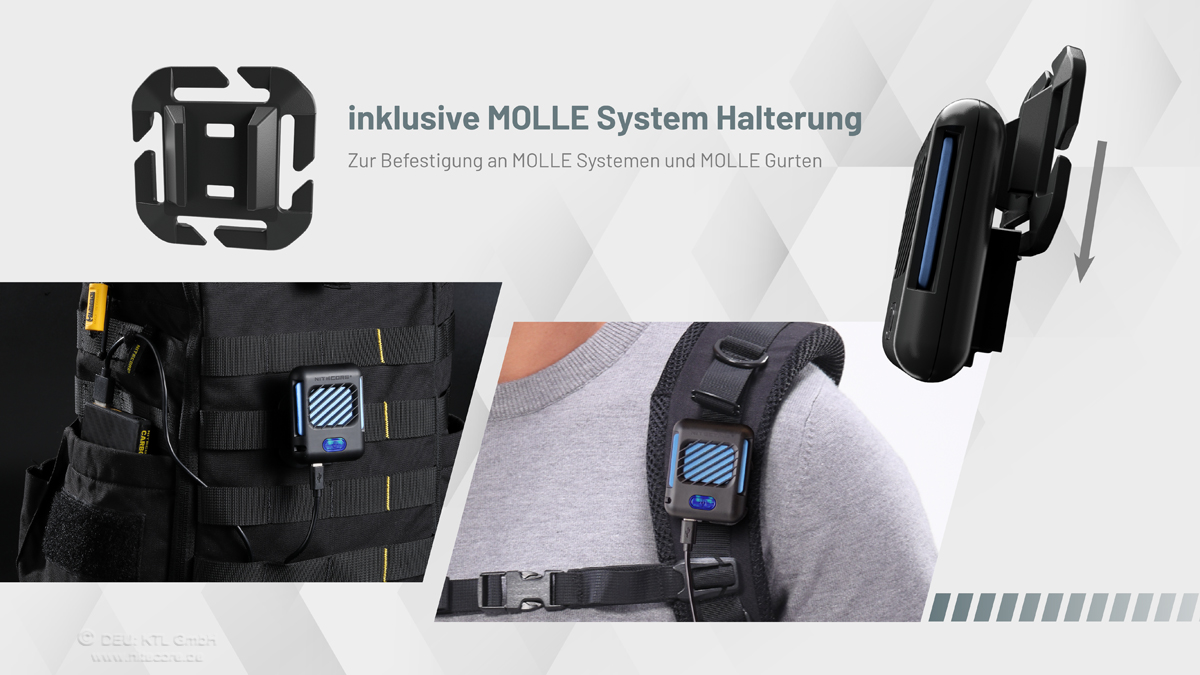 EIn Wirkstoffplätchen reicht für ca. 4 Stunden. Durch das MOLLE-Bracket lässt sich das EMR05 einfach an der Ausrüstung befestigen.
