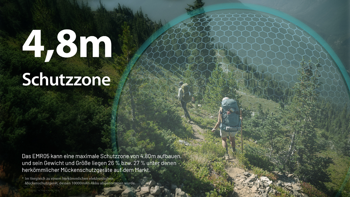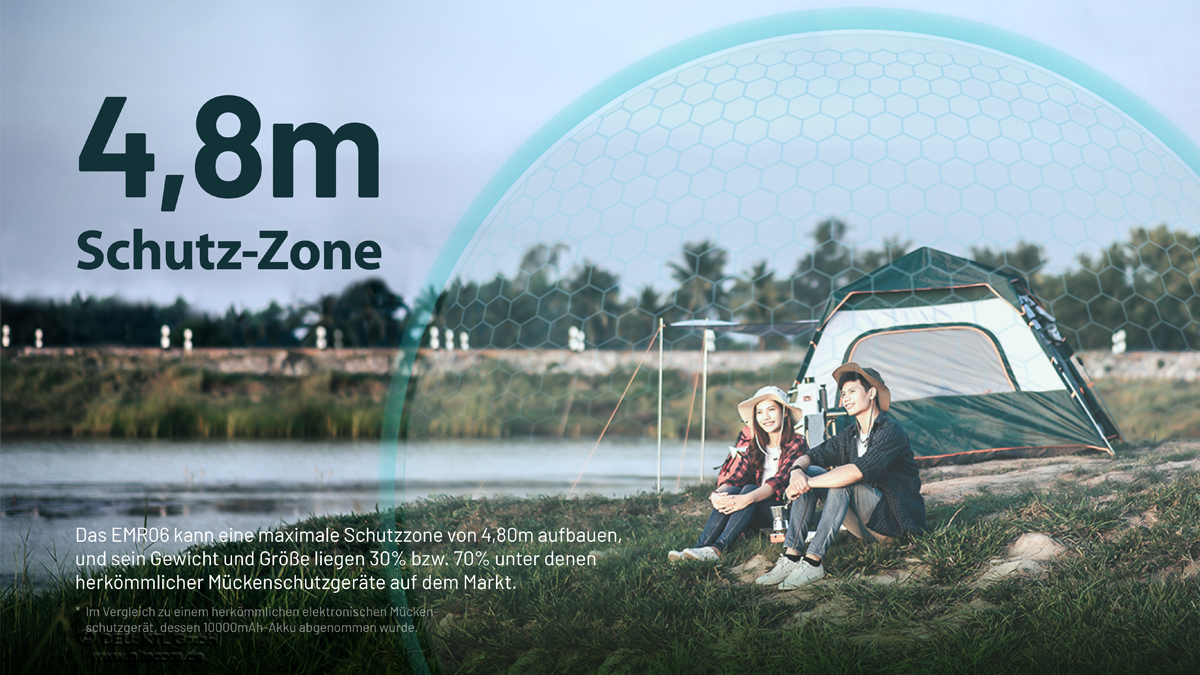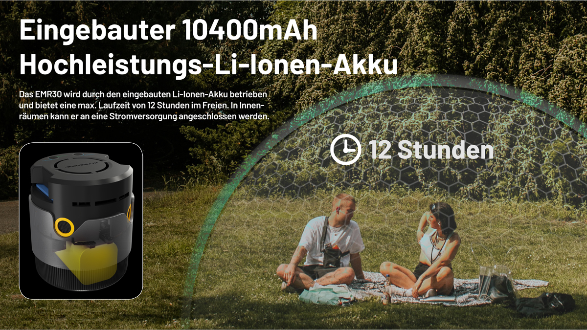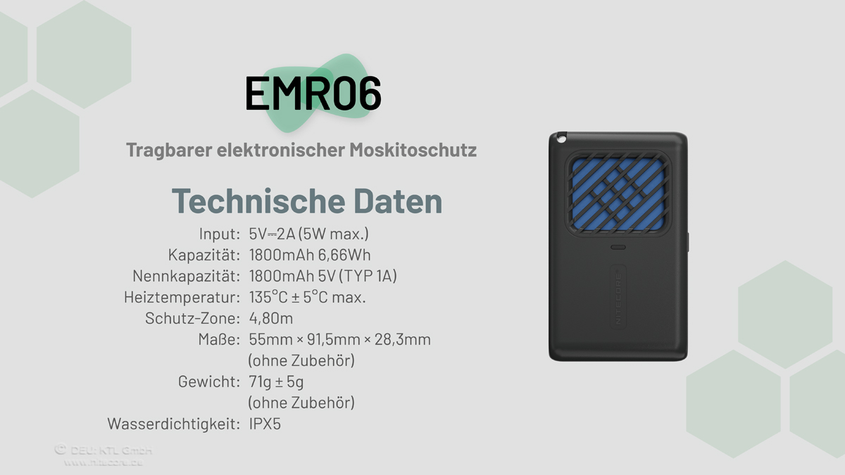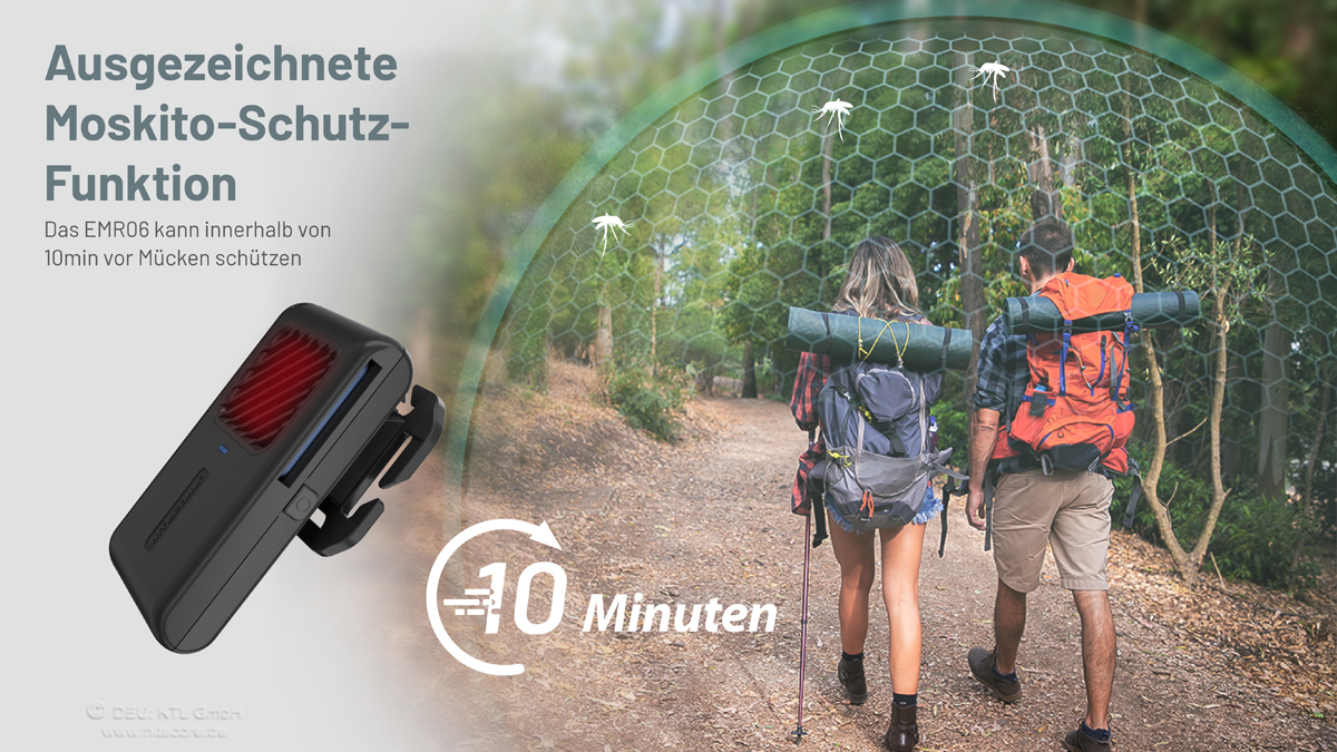 Nitecore EMR06 ist ein handliches Gerät zur Mückenabwehr. Das EMR06 verfügt über einen eingebauten Li-Ion Akku mit einer Kapazität von 1800mAh, Über diese Energiequelle wird die Heizaparatur betrieben und der Wirkstoff aus dem Wirkstoffplättchen zum Verdampfen gebracht. Die Kapazität des Akkus reicht für ca. 3,5 Stunden Einsatzdauer.