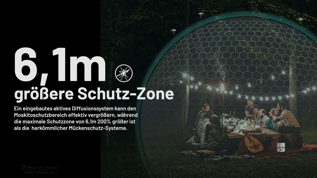 Es ensteht eine "Dunstglocke" mit ca. 6 Meter Durchmesser im Outdoor-Mode. Im Indoor-Mode beträgt der Durchmesser der Schutzzzone ca. 3,5 Meter