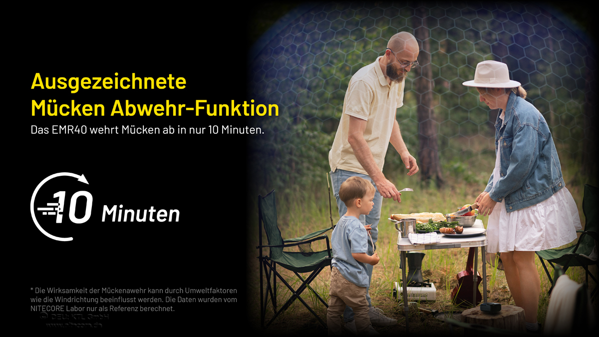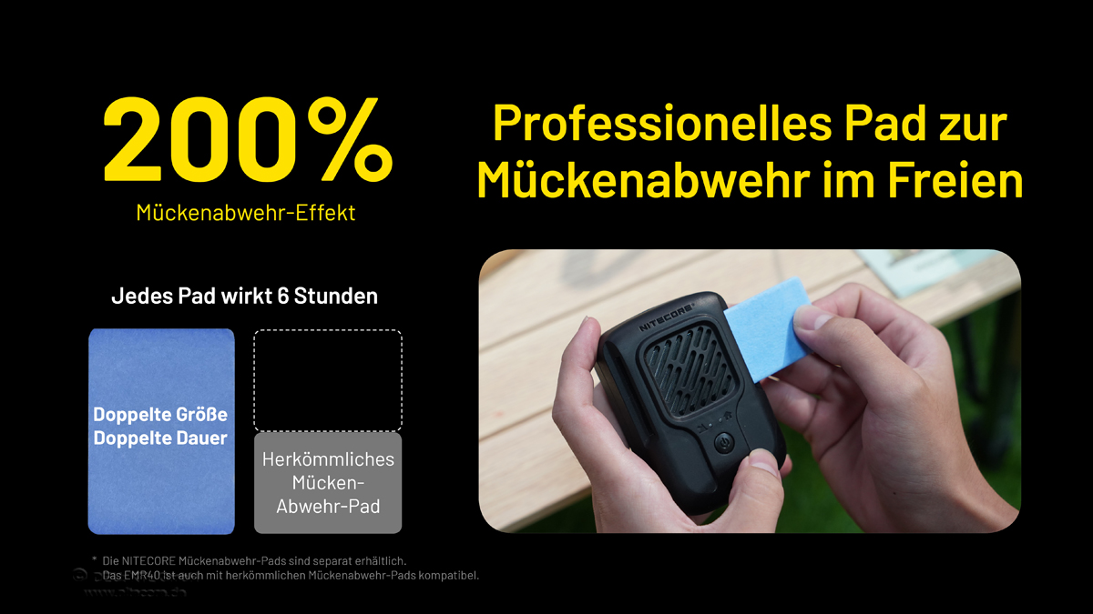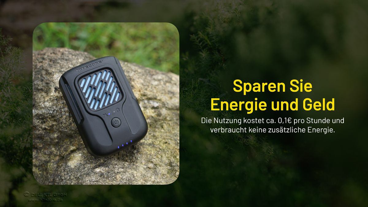 Das Nitecore EMR40 ist ein handliches Gerät zur Mückenabwehr. Das EMR40 verfügt über einen eingebauten Li-Ion Akku mit einer Kapazität von 7800mAh, Über diese Energiequelle wird die Heizaparatur betrieben und der Wirkstoff aus dem Wirkstoffplättchen zum Verdampfen gebracht. Die Kapazität des Akkus reicht für ca. 10 Stunden Einsatzdauer. Da der Wirkstoff durch eine akkubetriebene Heizplatte verdampft wird, müssen nur die Wirkstoffplättchen nachgekauft werden. Der Betrieb ist somit sehr kostensparend.