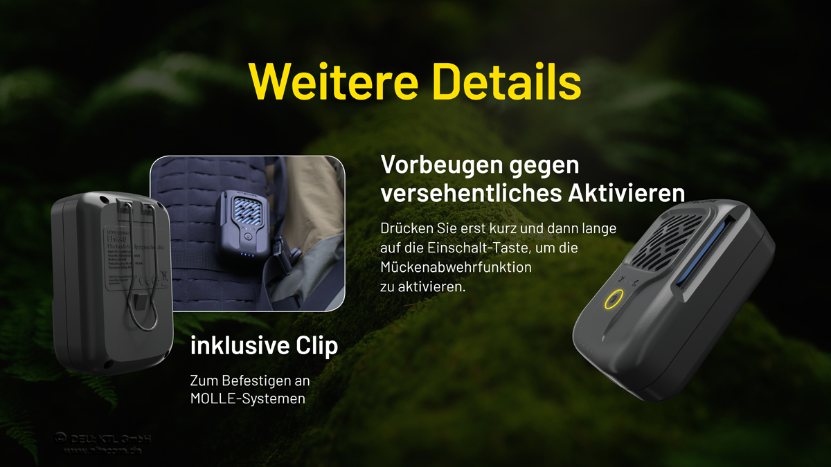Der verdampfte Wirkstoff ist geruchsneutral und erzeugt eine "Duftglocke" von max. 5 Meter Durchmesser. EIn Wirkstoffplätchen reicht für ca. 4 Stunden. Der EMR40 ist auf der Rückseite des Gehäuses mit einem robusten Clip versehen. Hiermit lässt sich das Gerät einfach und sicher an der Ausrüstung oder am Hosengürtel anbringen.. Nach dem Einschalten des EMR40 dauert es ca. 10 Minuten bis dier Wirkstoff seine volle Wirkung entfaltet.