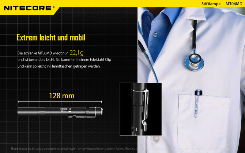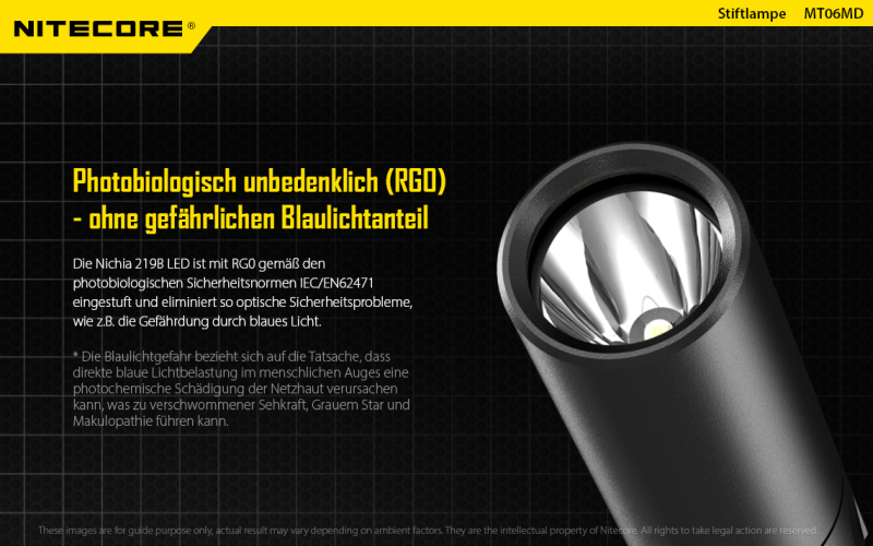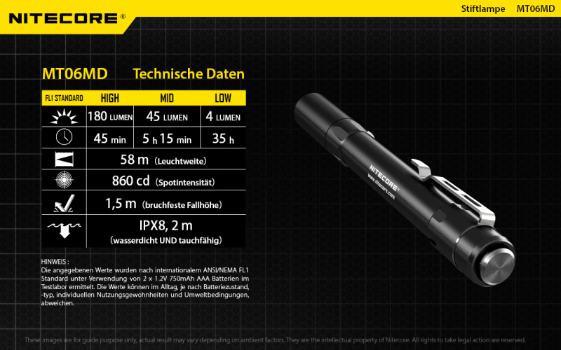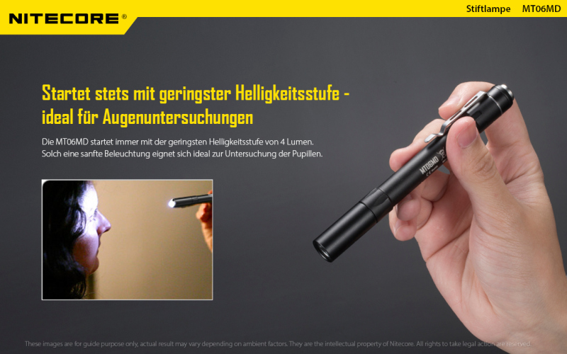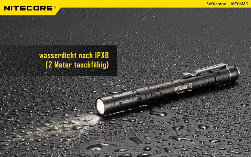 Lampe von Nitecore im Kugelschreiberformat. Die Nichia 219B LED (CRI > 90) leistet maximal 180 Lumen. Die Farbtemperatur der MT06MD beträgt photobiologisch unbedenktliche 5000K. Die Nitecore MT06MD startet IMMER in der kleinsten Leuchtstufe (4 Lumen).