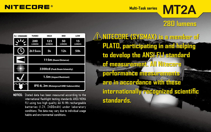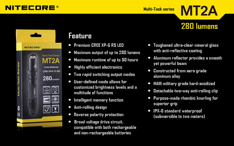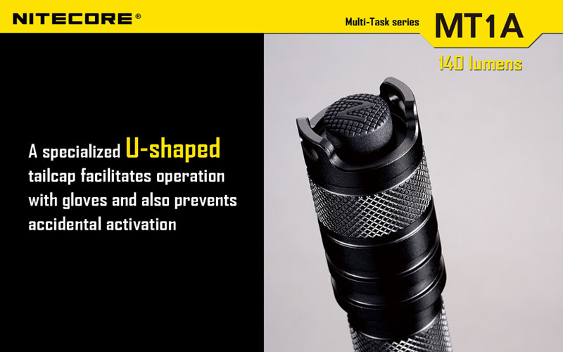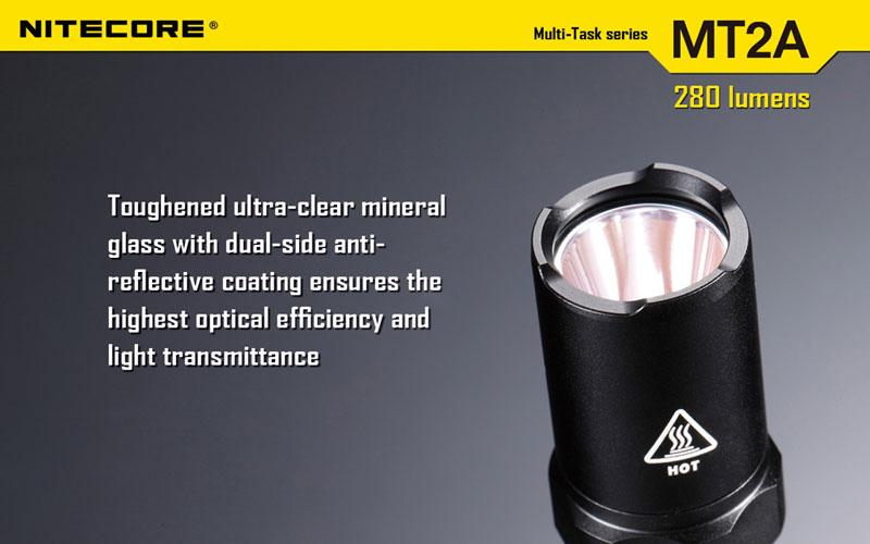 Die MT2A gehört zur neuen Multi Task-Serie von Nitecore. Alle Modelle dieser Serie verfügen über 4 Leuchtstufen, Strobe und SOS. Die maximale Leuchtstärke wird bei fest angezogenem Lampenkopf erreicht.