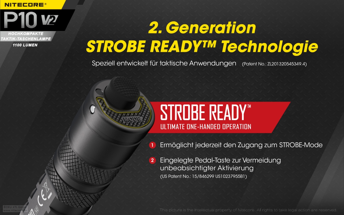 Die Nitecore P10 V2 ist der Nachfolger der P10GT. Die hier neu verwendete CREE XP-L2 V6 LED leistet maximal 1100 Lumen. 1100 Lumen werden nur bei Verwendung von 2 x CR123A Lithium Batterien erreicht. Bei Betrieb mit 1 x 18650 Li-Ion Akku sind maximal 1000 Lumen möglich. Die P10 V2 ist mit dem neuen Endschalter inkl. Strobe Ready Button ausgestattet und verfügt über drei Modi, die vom Benutzer gewählt werden können: