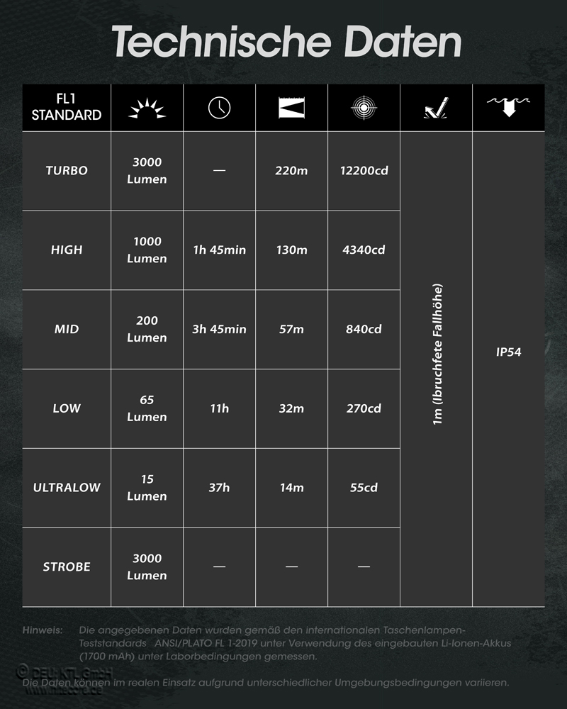 Turbo (3000 Lumen) für ca. 30 Minuten* High (1000 Lumen) für ca. 1 Stunden 45 Minuten Mid (200 Lumen) für ca. 3 Stunden 45 Minuten Low (65 Lumen) für ca. 11 Stunden Ultralow (15 Lumen) für ca. 37 Stunden Strobe