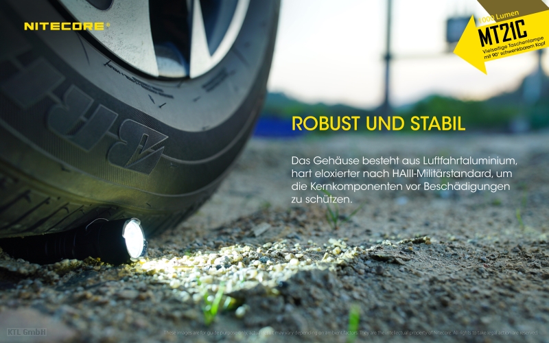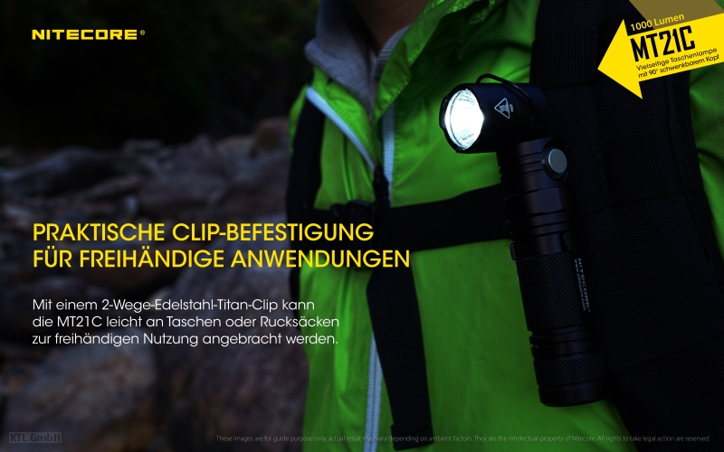 Die Nitecore MT21C zeichnet sich durch ihren um 90° schwenkbaren Lampenkopf und die damit verbundenen vielfälltigen Einsatzmöglichkeiten aus. Die verbaute CREE XP-L HD V6 LED leistet maximal 1000 Lumen. Bedient wird die MT21C durch den Frontschalter am Lampenkopf. Der Batteriedeckel ist magnetisch, dies erhöht die Einsatzmöglichkeiten.