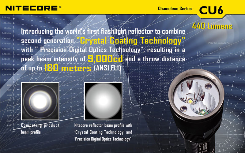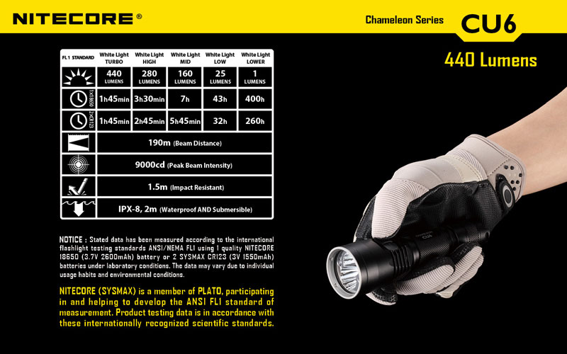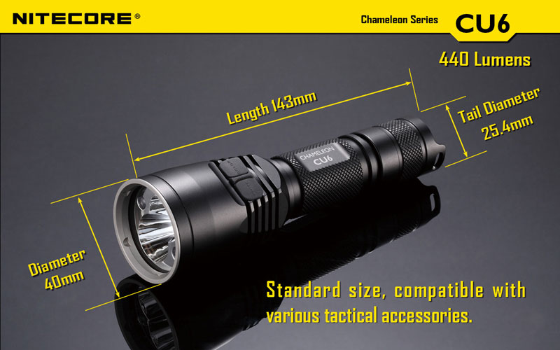 Mit der Chameleon Serie bringt NiteCore eine Taschenlampenserie, speziell für den jagdlichen und taktischen Einsatz konzipiert, auf den Markt. Die Chameleon CU6 ist mit 2 Haupt-LED´s (weiß und UV) sowie 2 Sekundär-LED´s (rot, grün, blau) ausgestattet. Die Chameleon Serie verfügt über 3 Schalter; den Endschalter zum Ein- und Ausschalten der Lampe und 2 Side Switches. Der eine Side Switch schaltet die 5 Leuchtstufen des weißen Hauptlichts, der andere die 3 Leuchtstufen des ultravioletten Hauptlichts sowie die drei Farben der Sekundär-LED`s. Die Side Switches haben eine integrierte Batteriestandsanzeige. Diese gibt durch Blinksignale die Batteriespannung an.