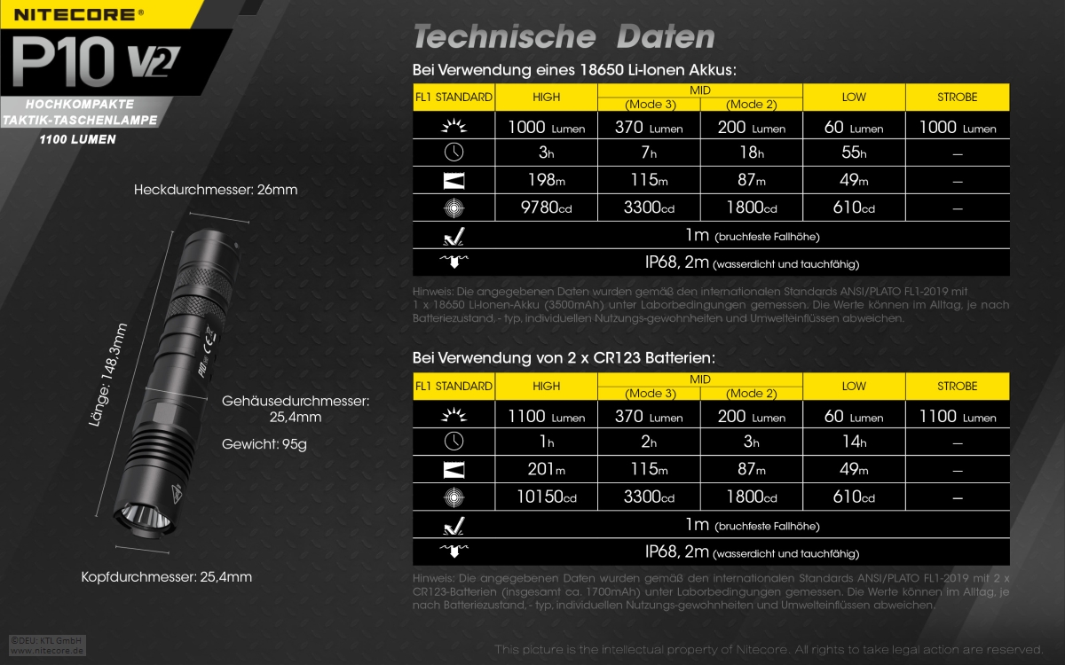 Die Nitecore P10 V2 ist der Nachfolger der P10GT. Die hier neu verwendete CREE XP-L2 V6 LED leistet maximal 1100 Lumen. 1100 Lumen werden nur bei Verwendung von 2 x CR123A Lithium Batterien erreicht. Bei Betrieb mit 1 x 18650 Li-Ion Akku sind maximal 1000 Lumen möglich. Die P10 V2 ist mit dem neuen Endschalter inkl. Strobe Ready Button ausgestattet und verfügt über drei Modi, die vom Benutzer gewählt werden können:
