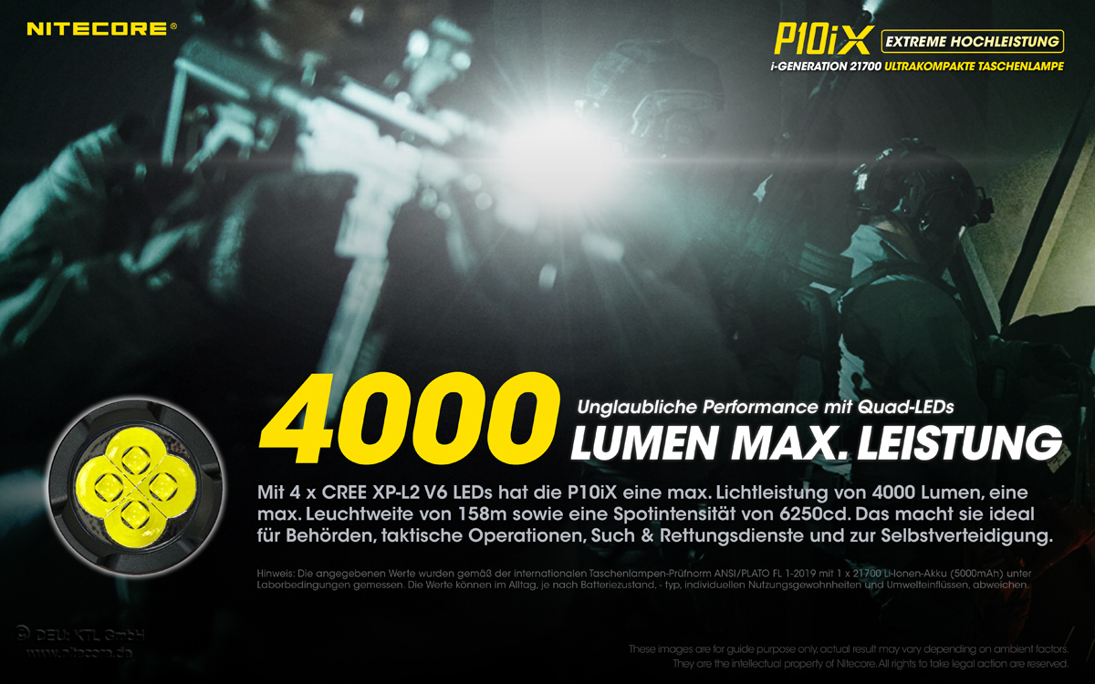 Technische Daten: • maximal 6000 Lumen • 4 x CREE XHP35 HI LEDs, • OLED Multifunktionsdisplay • Thermische Schutzschaltung • Betrieb mit 4 x 18650 Akkus (kein Betrieb mit CR123A Lithium Batterie möglich) • Integrierte Ladefunktion mit verschiedenen Schutzfunktionen • Lange Brenndauer bei Betrieb 4 x IMR18650 Akkus • 5 Leuchtstufen, 3 Blinkmodi • Innovativer Zwei-Stufen-Schalter • Beschichtete und kratzfeste Glaslinse • Edelstahlring am Lampenkopf schützt vor Beschädigung • Gehäuse aus Luftfahrt-Aluminium • HAIII hartanodisiert • Spritzwassergeschützt nach IPX8 Standard (2 Meter)