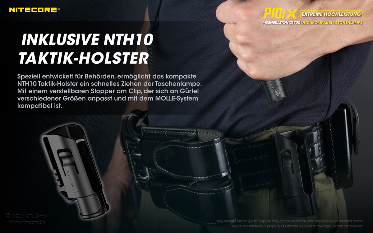 Lieferumfang: Nitecore P10 V2, Lanyard, Taktisches Holster NTH10, Batteriemagazin, Ersatz-Dichtring, 2 x CR123A Lithium Batterien