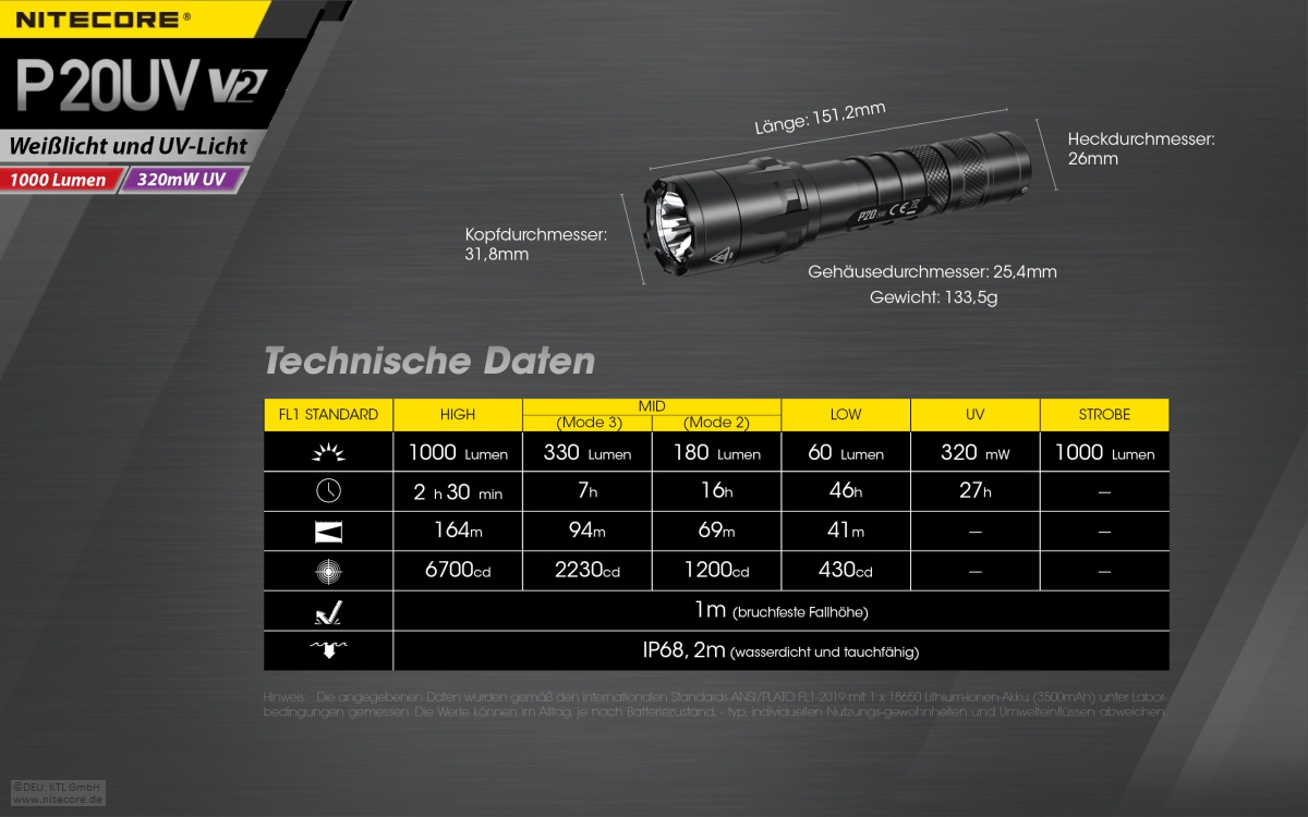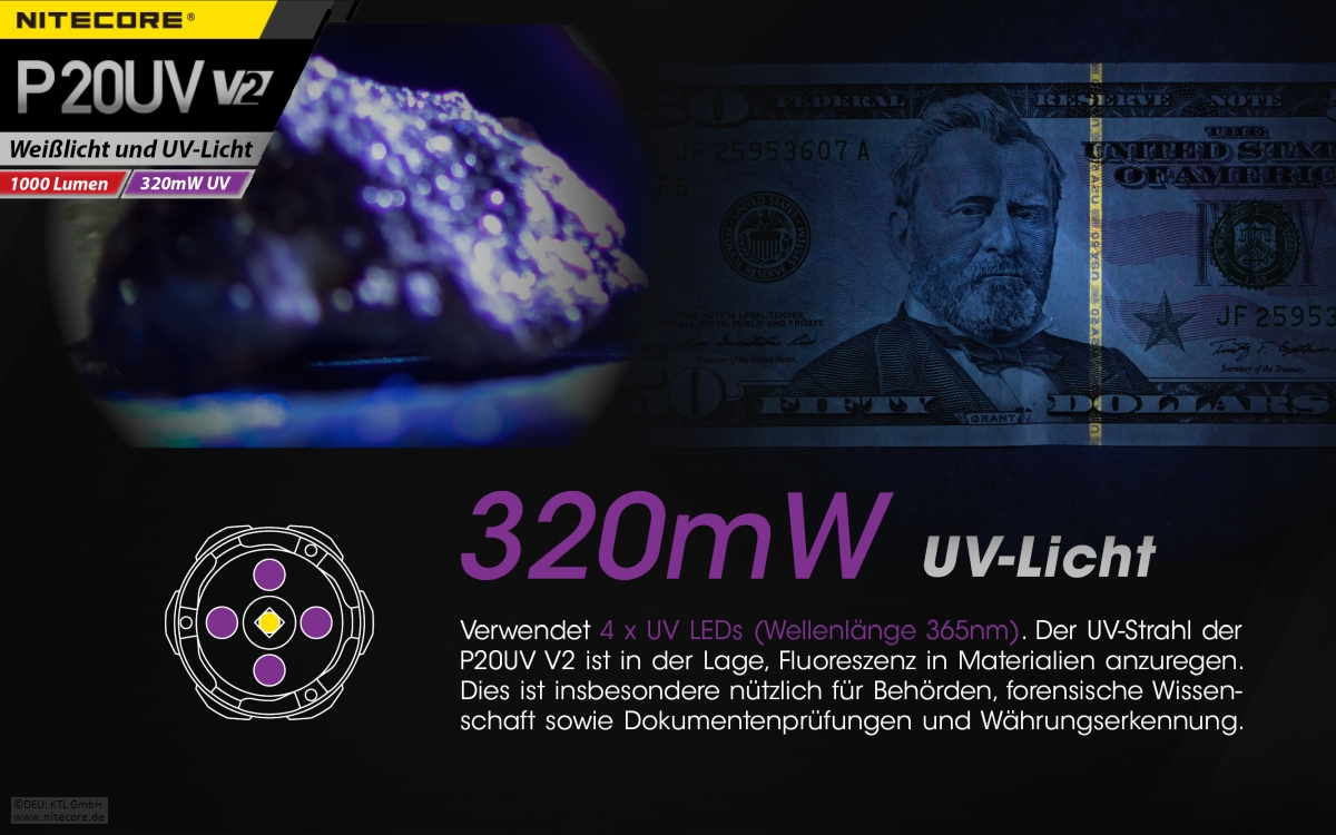 Leuchtleistung: weiße Haupt-LED max 440 Lumen, Ultraviolett-LED 3000mW und 365nm Wellenlänge Leuchtweite: weiße Haupt-LED ca. 190 m Batterien: 1 x 18650 Li-Ion Akku, 2 x RCR123 (16340) Li-Ion Akku oder 2 x CR123A Lithium Batterien Verpolungsschutz Titanbeschichteter Stahlclip Linse aus Mineral-Glas mit AR-Beschichtung Gehäuse aus Luftfahrt-Aluminium Mil-Standard HAIII hartanodisiert Spritzwassergeschützt nach IPX-8
