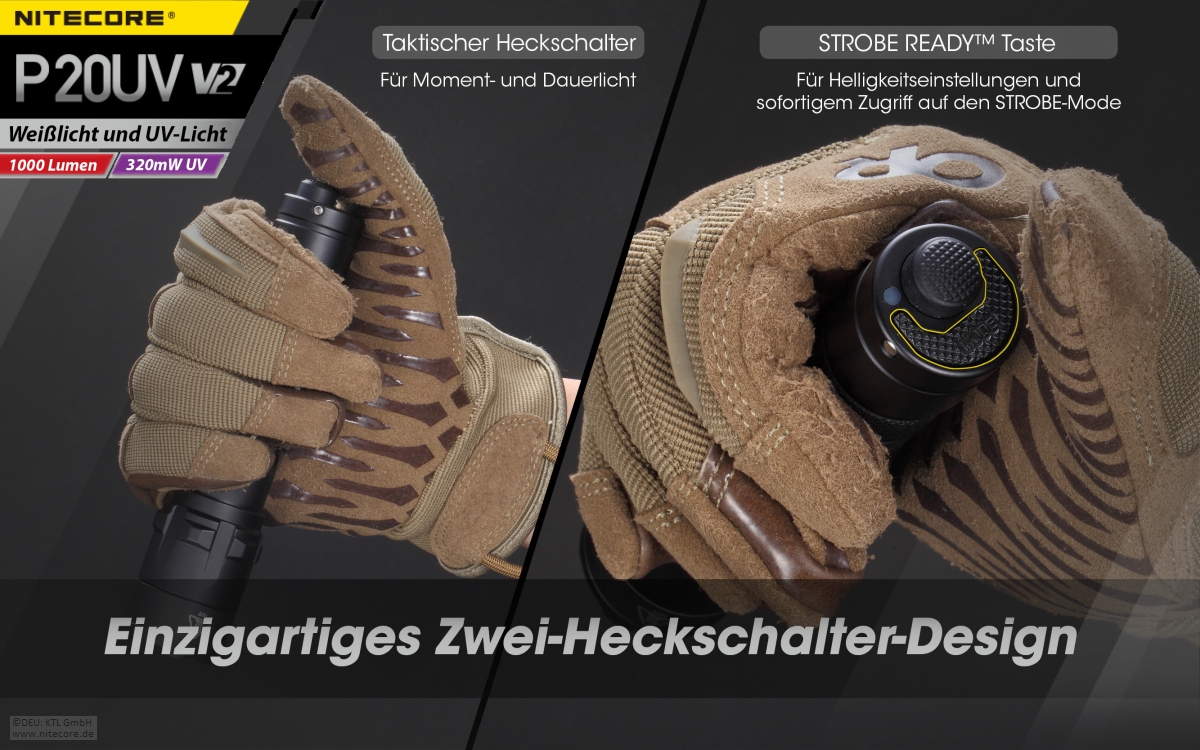 Die neue Nitecore P20UV V2 ist das Nachfolge-Modell der P20UV und gehört zur Precise-Serie von Nitecore. Die taktische Taschenlampe P20UV V2 hat einige Neuerungen erfahren.Sie verfügt jetzt über eine CREE XP-L2 V6 LED leistet maximal 1000 Lumen. Ebenfalls neu ist der überarbeitete Endschalter mit STROBE Ready Button, Glasbrecher mit Ceramic-Einsätzen und Aufnahmemöglichkeiten für den Tactical Ring NTR10 (optionales Zubehör). Das UV-Licht hat eine Leistung von 320mW und eine Wellenlänge von 365nm. Über diesen Schalter den STROBE Ready Button kann der Strobe Modus jederzeit - auch bei ausgeschalteter Lampe - sofort aktiviert werden.