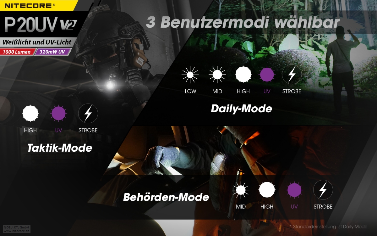 Die P20UV V2 verfügt über drei Modi die vom Benutzer gewählt werden können: Tactical Mode: Nur High, UV und STROBE Law Enforcement Mode: Medium, High, UV und STROBE Daily Mode: Low, Medium, High, UV und STROBE