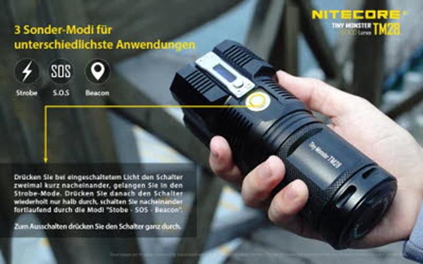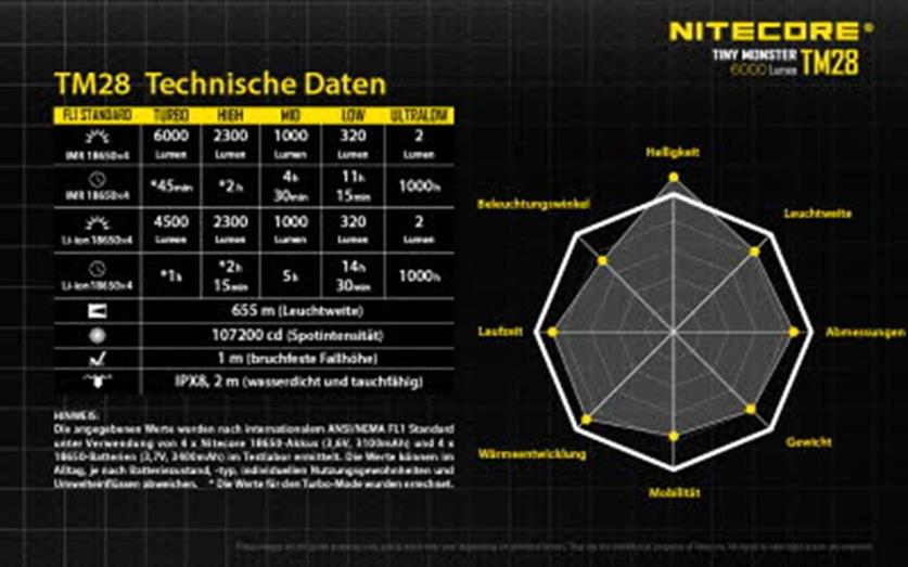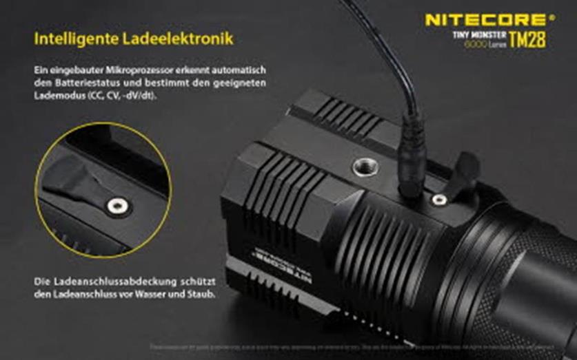 Lieferumfang: 1 x NiteCore TM28, Holster, Adaptger, Abdeckung für Ladeanschluß, Ersatz-Dichtring