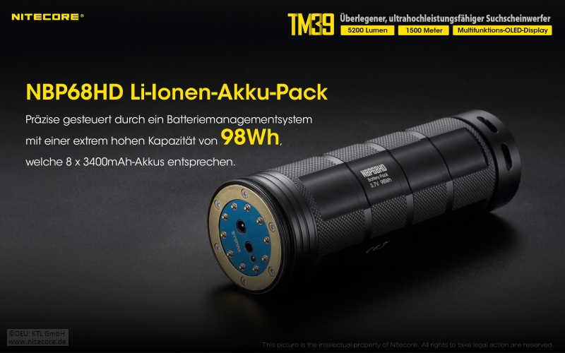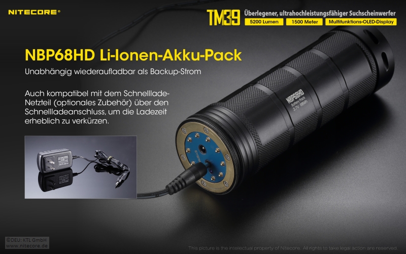 Lieferumfang: Nitecore TM39, Tragegurt, Ersatzdichtring, 230V Ladekabel, Akkupack BP68HD