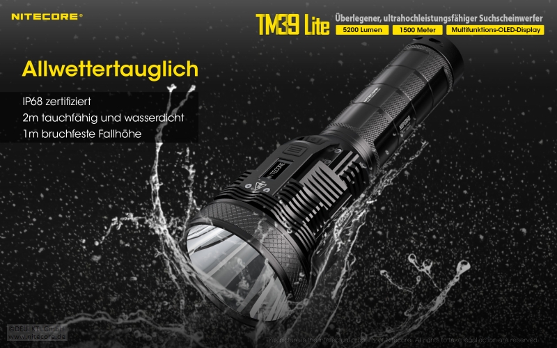 Lieferumfang: Nitecore TM39 Lite, Tragegurt, Ersatzdichtring, 230V Ladekabel