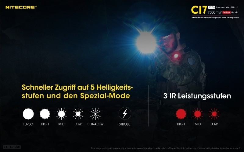 Turbo (2500 Lumen) für ca. 30 Minuten* High (1100 Lumen) für ca. 1 Stunde 45 Minuten Mid (320 Lumen) für ca. 4 Stunden 15 Minuten Low (90 Lumen) für ca. 20 Stunden Ultralow (8 Lumen) für ca. 130 Stunden Strobe Leistung und Brenndauer IR-Licht (18650 Li-Ion 8A) High (7 W) für ca. 2 Stunden Mid (3 W) für ca. 3 Stunden 15 Minuten Low (1 W) für ca. 9 Stunden * Die Brenndauer im Turbomodus ist ein errechneter Wert Lieferumfang: Nitecore CI7, Holster, Clip, Ersatz-Dichtring, Lanyard, Li-Ion Akku Typ NL1835HP