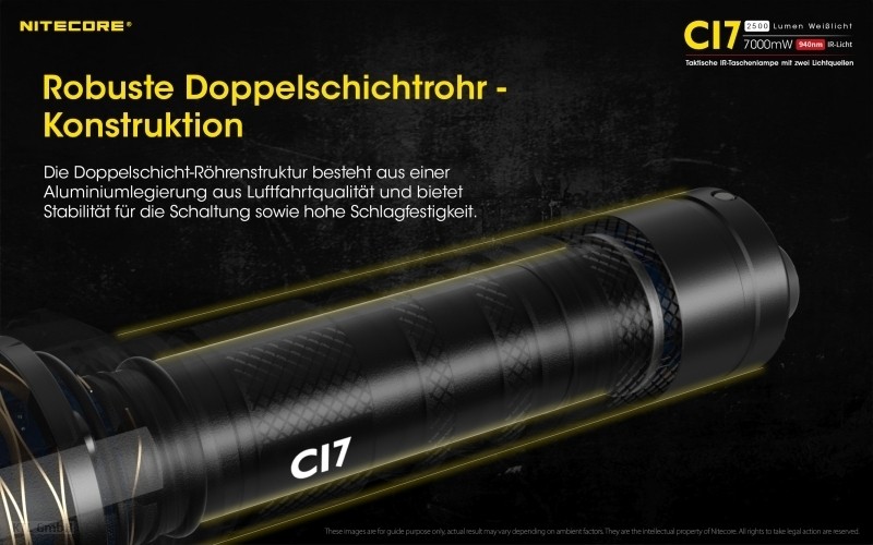 Die Nitecore CI7 ist eine taktische Taschenlampe mit 2500 Lumen Weißlicht und einem IR-Licht mit max. 7W. Die CI7 ist mit je 4 LED´s
