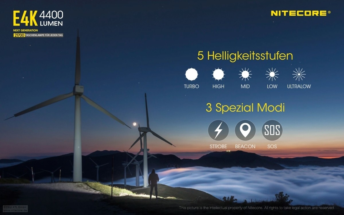 Die Nitecore E4K ist eine leistungsstarke EDC-Lampe betrieben mit einem 21700er Li-Ion Akku. Die 4 Stück CREE XP-L2 V6 LED´s leisten maximal 4400 Lumen.