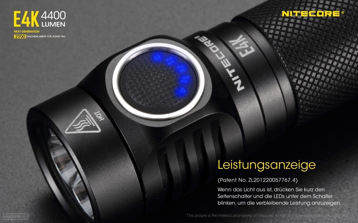 Die Ein-Knopf-Bedienung der Nitecore E4K macht die Handhabung extrem nutzerfrerundlich. Der zum Lieferumfang gehörende Li-Ion Akku NL2150HPR verfügt über