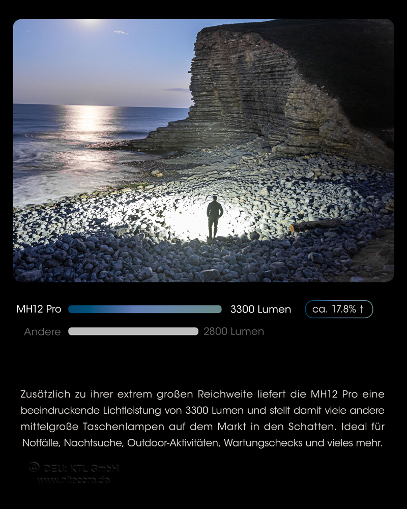 Die Leistungsdaten der MH12 Pro sind beeindruckend und konkurrenzlos bezogen auf die Baugröße der Lampe: 3300 Lumen Leuchtstärke, 505 Meter Leuchtweite, USB-C-Aufladung, 5300mAh Akku.