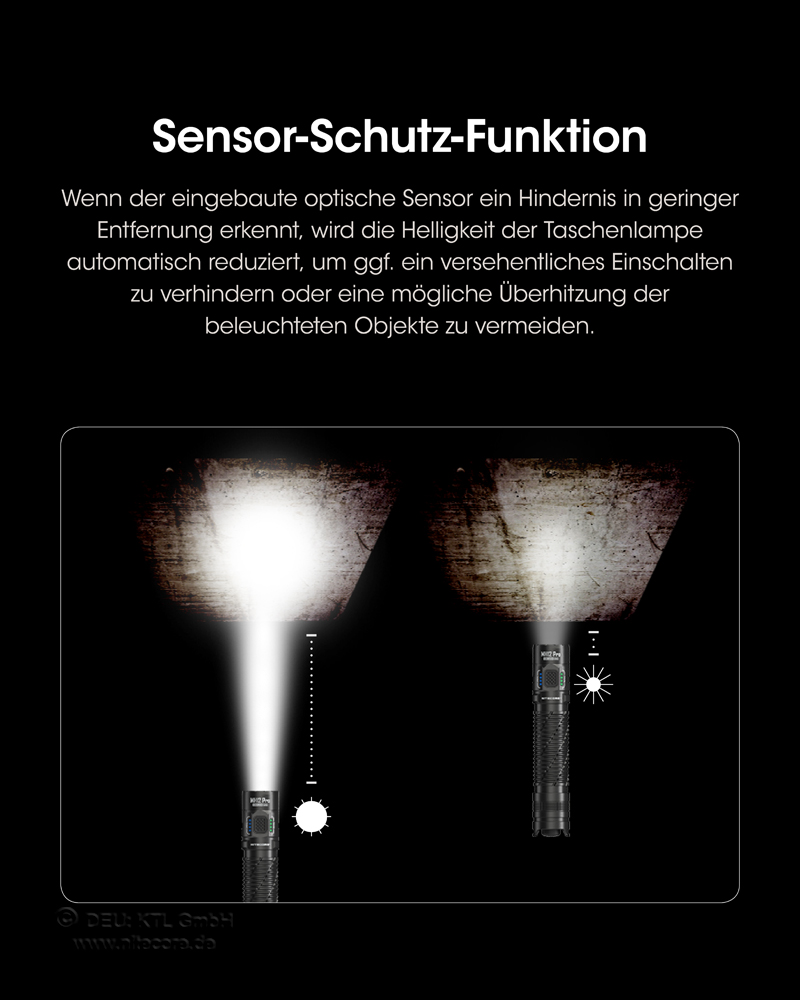 Ein eingebauter optischer Sensor reduziert die Leuchstärke der MH12 Pro sofort um eine Beschädigung der Lampe oder eines Gegenstandes (z.B. Rucksack) zu verhindern.