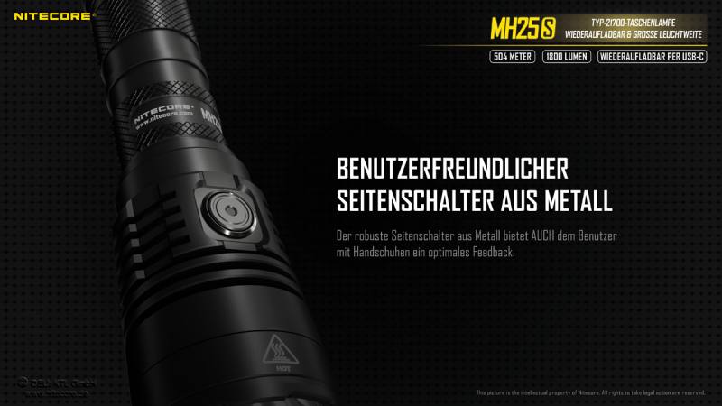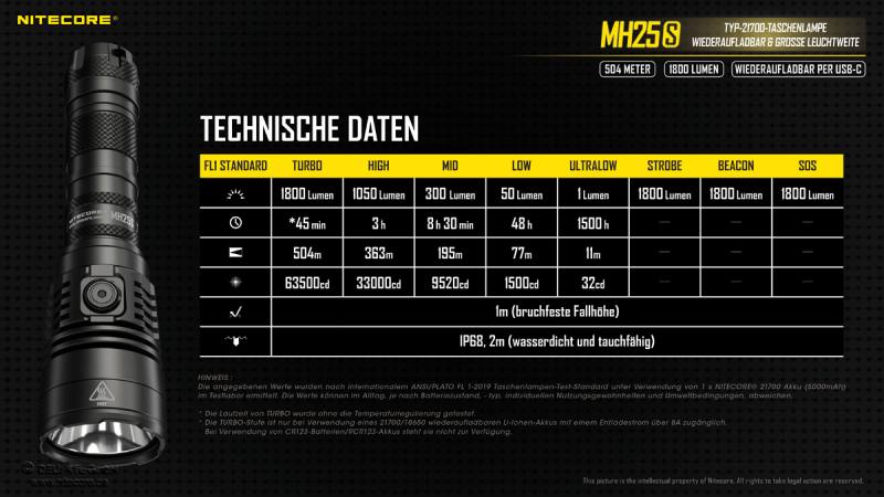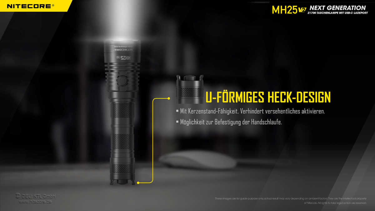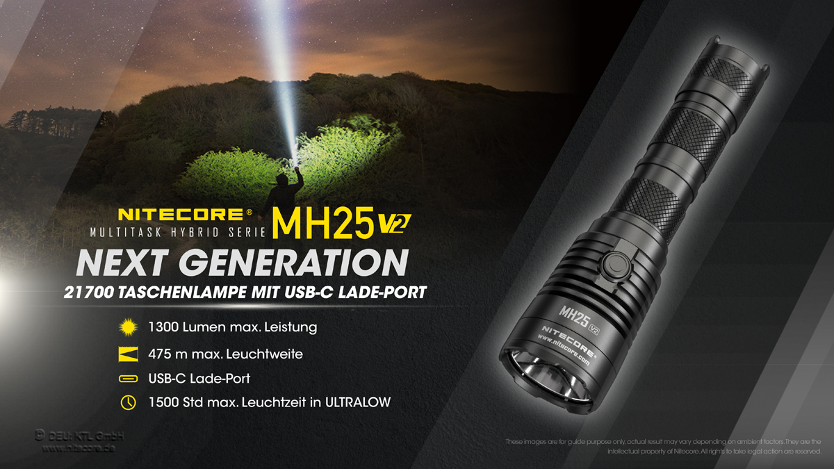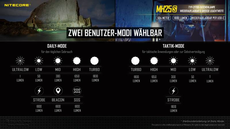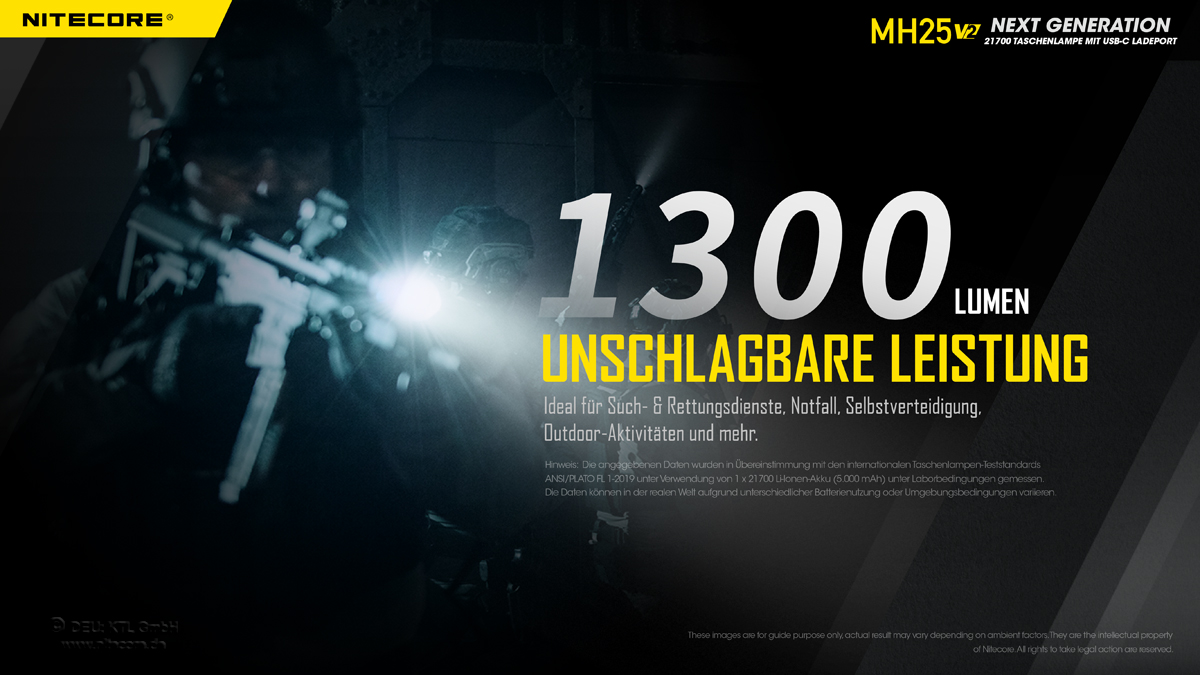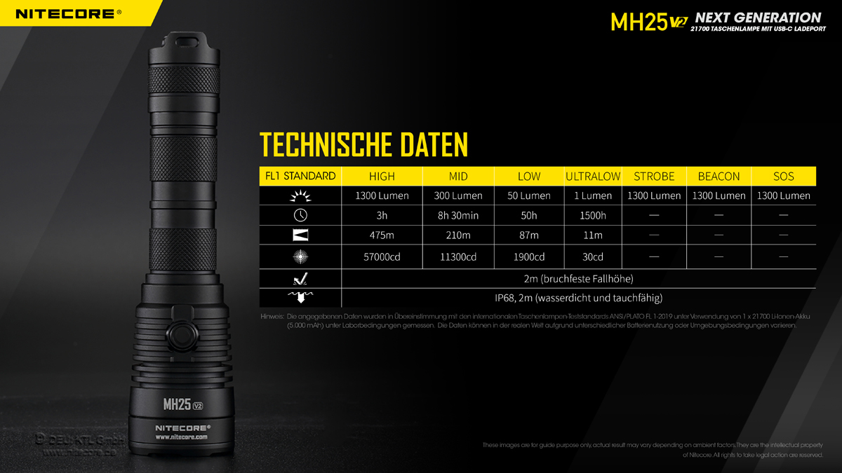 Mit dem Betrieb der MH25 V2 durch einen 21700er Akku setzt Nitecore konsequent den Wechsel auf die neueste Akkutechnik fort. Der größte Vorteil des neuen Akkus ist die enorme Brenndauer von bis zu 1500 Stunden im Ultralow Mode. Wie gewohnt verfügt die über einen taktischen Endschalter und ein seitlichen Mode-Schalter. Für den Nutzer stehen zwei unterschiedliche, vorwählbare Modi zur Verfügung; der Tactical und der Daily Mode. Leistung und Laufzeit: (1 x 21700 Li-Ion Akku 5000mAh) High (1300 Lumen) für ca. 3 Stunden