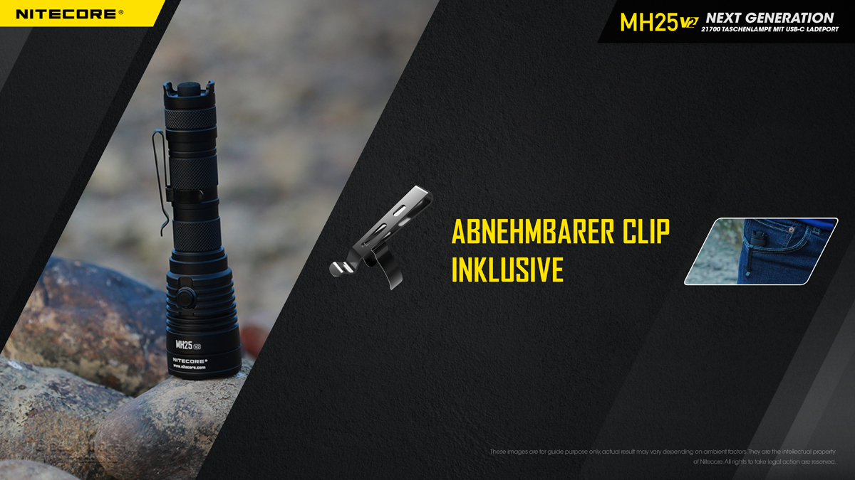 Lieferumfang: Nitecore MH25 V2, Li-Ion Akku (21700/5000mAh), USB-C-Ladekabel, Nylonholster, Clip, Batteriemagazin, Handschlaufe, Ersatzdichtring