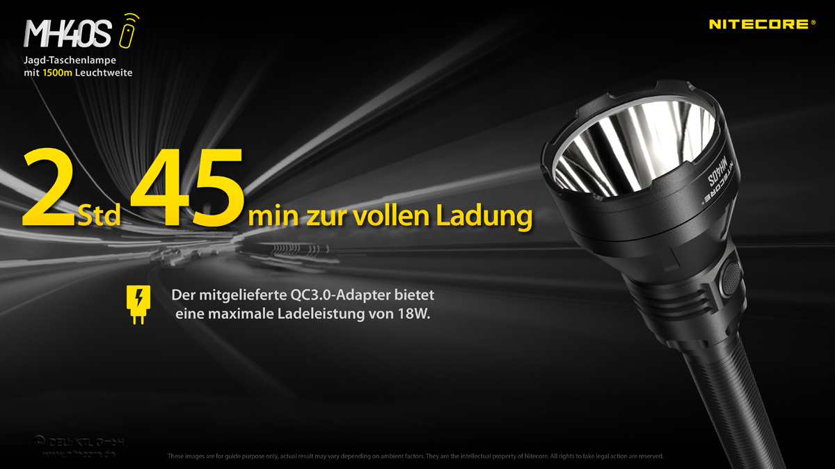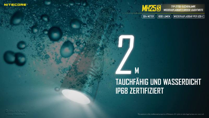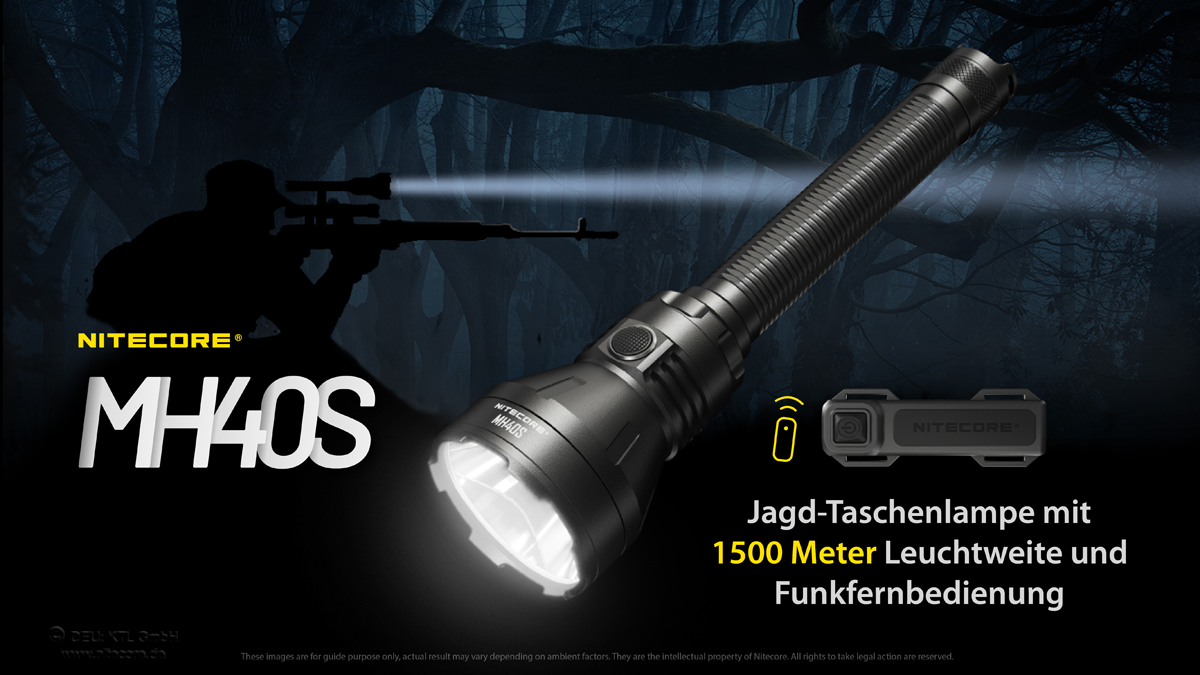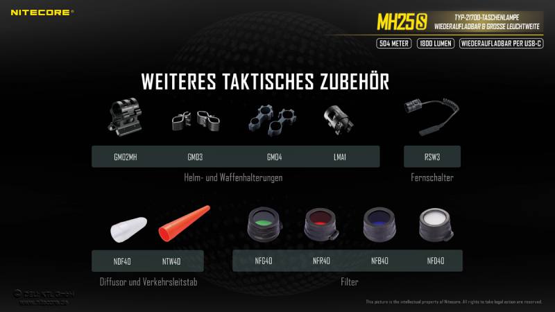 Lieferumfang: Nitecore MH40S, 2 x Li-Ion Akku (21700/5000mAh), kabelloser Fernschalter, QC3.0-Adapter, USB-C-Ladekabel, Ersatzdichtringe, Klettlasche, 2 x Befsetigungsstraps, Holster