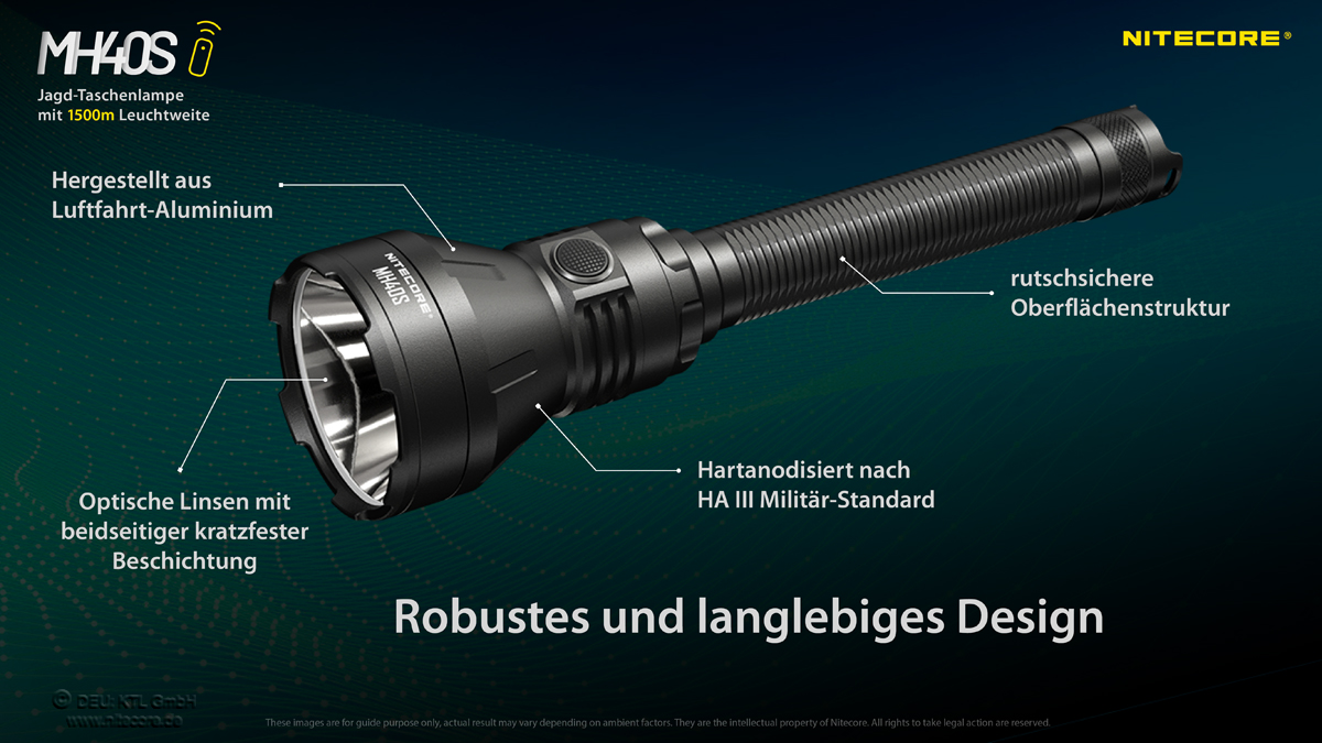 Die Nitecore MH40S gehört zur Multitask Hybrid Serie von Nitecore. Die MH40S ist eine Stablampe mit 1500 Lumen und einer unglaublichen Leuchtweite von 1500 Metern. Erstmals wird in der MH40S die neue LED Luminengin G9 verbaut. Diese LED zeichnet sich durch geringeren Energiverbrauch und ein 50 % kleinere Bauform als der Vorgänger aus.