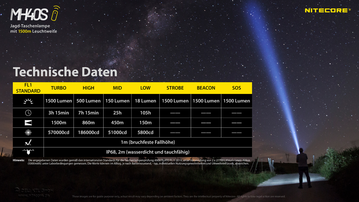 Leistung und Laufzeit (2 x 21700 Li-Ion Akku 5000mAh) Turbo (1500 Lumen) für ca. 3 Stunden 15 Minuten High (500 Lumen) für ca. 7 Stunden 15 Minuten Mid (150 Lumen) für ca. 25 Stunden Low (18 Lumen) für ca. 105 Stunden Strobe SOS Beacon