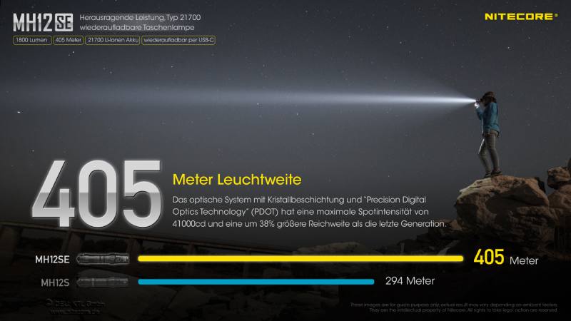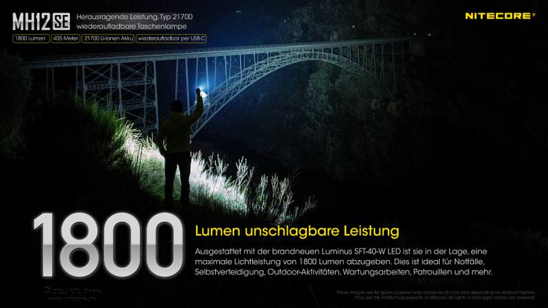 Mit der MH12SE präsentiert Nitecore das Nachfolgemodell der beliebten MH12S. Die Nitecore MH12SE ist ausgestattet mit einer Luminus SFT-40-W LED (max. 1800 Lumen) und einem integriertem Ladegerät (über USB-C). Die Leuchtweite der MH12SE wurde gegenüber dem Vorgänger um ca. 110 Meter auf 405 Meter gesteigert.