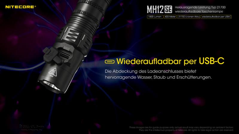 Lieferumfang: Nitecore MH12SE, Li-Ion Akku (21700/5000mAh), USB-C-Ladekabel, Kunststoffholster NTH10, Clip, Batteriemagazin, Handschlaufe, Ersatzdichtring