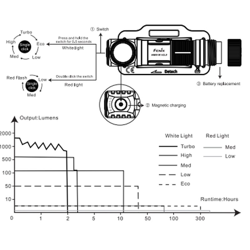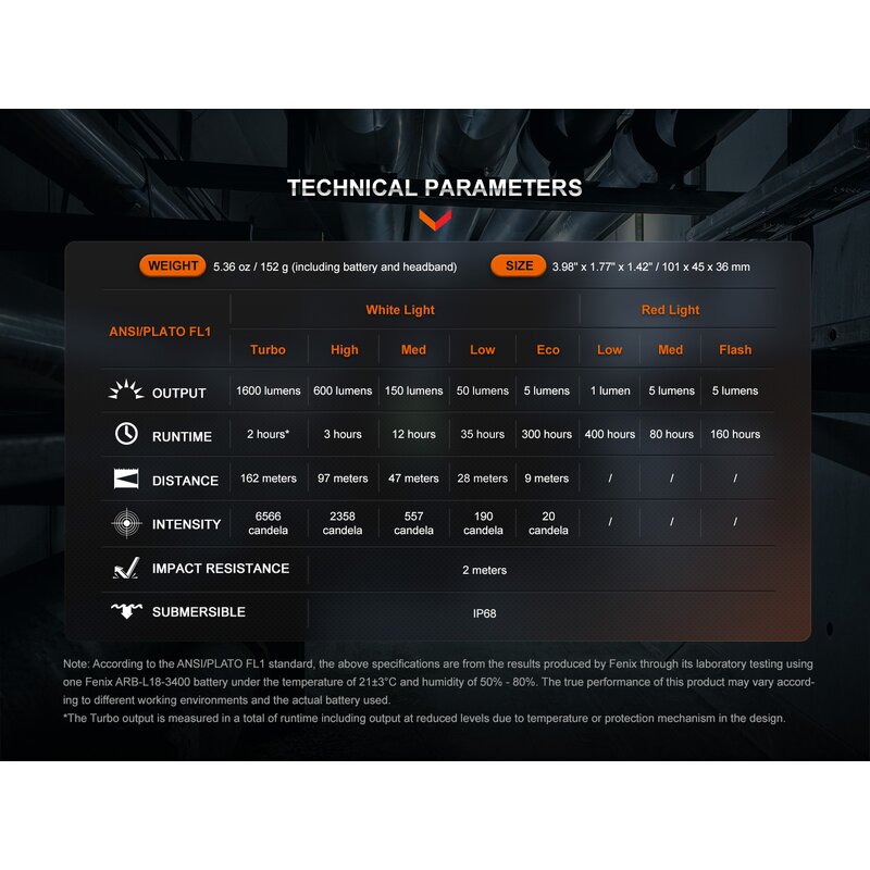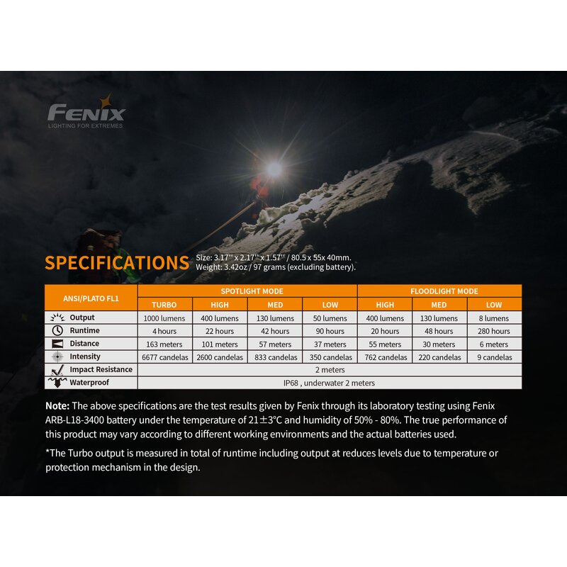 Note: According to the ANSI/PLATO FL1 standard, the above specifications are from the results produced by Fenix through its laboratory testing using one Fenix ARB-L18-3400 battery under the temperature of 21±3°C and humidity of 50% - 80%. The true performance of this product may vary according to different working environments and the actual battery used. *The Turbo output is measured in a total of runtime including output at reduced levels due to temperature or protection mechanism in the design.