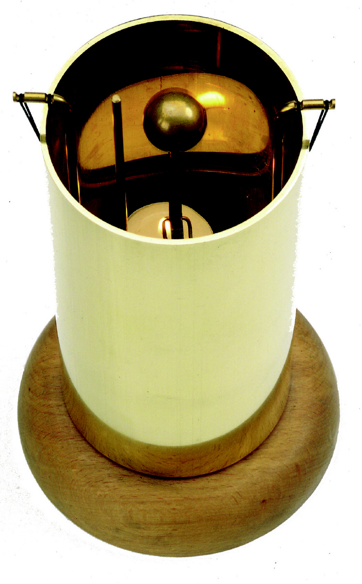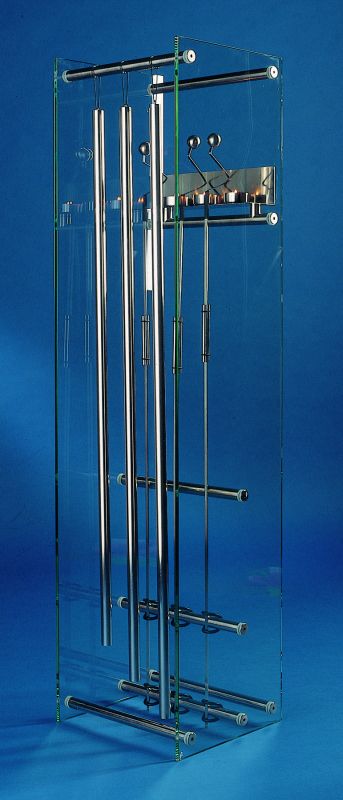 In einer ästhetisch und akustisch an-sprechenden Form ist bei dem Klang-objekt 'Inner Vibes' die Umsetzung von Temperaturunterschieden in Be-wegung und Ton realisiert]. Ein klassisches Bimetallband wird mit einem Teelicht erwärmt und bewegt dadurch einen Klöppel von der Kerze weg. Nach Abkühlung geht der Klöppel wieder zu-rück usw. Die ganze Vorrichtung ist im Inneren eines frei aufgehängten, 20cm hohen Messingzylinders ange-bracht (Abbildung 6 links), so dass der Klöppel beim Anstoßen das Messingrohr zum Klingen bringt. Der Zylinder tönt verhalten und ange-nehm wie eine Glocke. Aufgrund des Flackerns der Flamme stellt sich keine feste, sondern eher chaotische Wiederholfrequenz des Tones ein. Die mittlere Wiederholfrequenz kann durch lokale Verschiebung der Flamme des Teelichtes dem eigenen Wohlempfinden entspre-chend variiert werden. Der akustische Effekt wird durch die Wirkung des oben und unten aus dem Zylinder herausleuchtenden Kerzenlichts durch einen entsprechenden optischen Reiz bereichert.