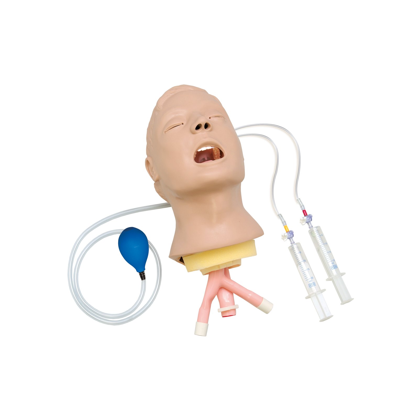Eigenschaften: • Atemwegsbehandlung - Anatomisch korrekte Nasenlöcher, Zähne, Zunge, Mund- und Nasenrachen, Kehlkopf, Ringknorpel, Kehldeckel, Aryknorpel, falsche und echte Stimmbänder, Luft- und Speiseröhre. - Üben Sie die orale, digitale und nasale Intubation. o Intubieren Sie mit einem E.T. (Endotrachealtubus), E.O.A. (Ösophagusobturator), P.T.L. (Pharynx- Tracheal-Lumen), Combitube® und King System. - Üben Sie Absaugverfahren und das richtige Aufpumpen der Manschette. - Sichtbares Heben des Brustkörpers und Aufblähen des Magens.