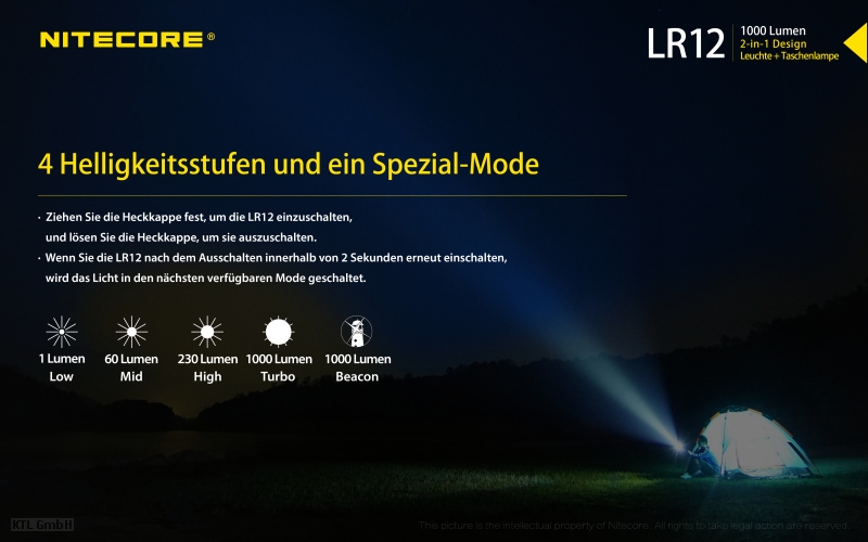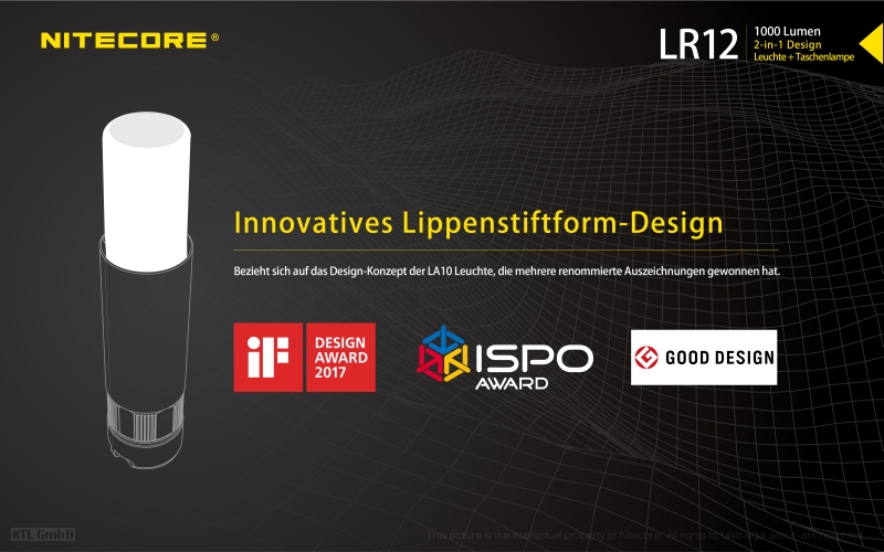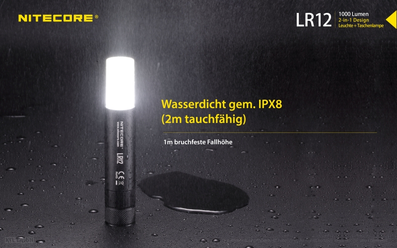 Die LR12 von Nitecore vereint die Funktionen eine Camping-Laterne und einer Taschenlampe. Der Diffusor der LR12 kann wie ein Lippenstift ausgefahren werden, so fungiert die LR12 als Laterne, bei eingefahrenem Diffusor als Taschenlampe mit bis zu 166m Leuchtweite. Die CREE XP-L HD V6 LED leistet maximal 1000 Lumen. Betrieben wird die LR12 mit 2 x CR123A Batterien oder einem 18650 Li-Ion Akku.